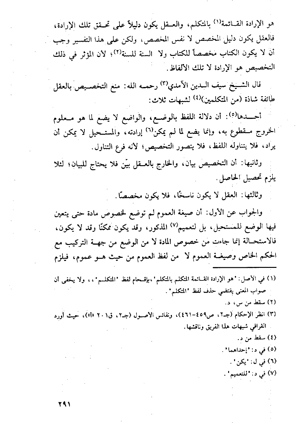 قال الشيخ سيف الدين الآمدي رحمه الله: منع التخصيص بالعقل طائفة شاذة (من المتكلمين) لشبهات ثلاث:
