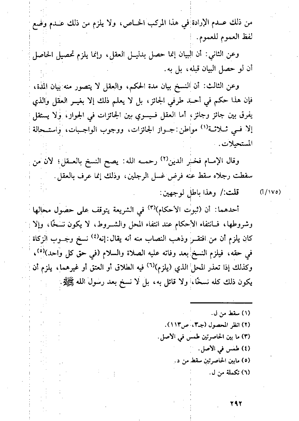 أحدهما: أن (ثبوت الأحكام) في الشريعة يتوقف على حصول محالها وشروطها، فانتفاء الأحكام عند انتفاء المحل والشروط، لا يكون نسخًا، وإلا كان يلزم أن من افتقر وذهب النصاب منه أنه يقال: إنه نسخ وجوب الزكاة في حقه، فيلزم انسخ بعد وفاته عليه الصلاة والسلام (في حق كل واحد)، وكذلك إذا تعذر المحل الذي (يلزم) فيه الطلاق أو العتق أو غيرهما، يلزم أن يكون ذلك كله نسخًا، ولا قائل به، بل لا نسخ بعد رسول الله - صلى الله عليه وسلم -.