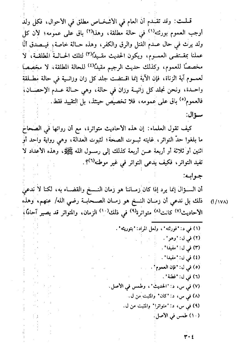 قلت: وقد تقدم أن العام في الأشخاص مطلق في الأحوال، فكل ولد أوجب العموم بورثته في حالة مطلقة، وهذا باق على عمومه؛ لأن كل ولد يرث في حال عدم القتل والرق والكفر، وهذه حالة خاصة، فيصدق أنا عملنا بمقتضى العموم، ويكون الحديث مقيدًا لتلك الحالة المطلقة، لا مخصصًا للعموم، وكذلك حديث الرجيم مقيدًا للحالة المطلقة، لا مخصصًا لعموم آية الزناة، فإن الآية إنما اقتضت جلد كل زان وزانية في حالة مطلقة واحدة، ونحن نجلد كل زانية وزان في حالة، وهي حالة عدم الإحصان، فالعموم باق على عمومه، فلا تخصيص حينئذ، بل التقييد فقط.