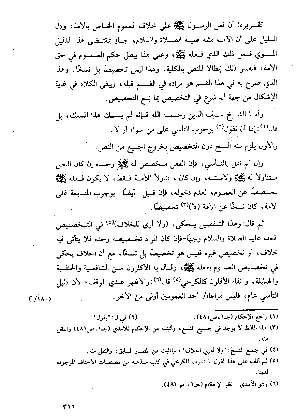 تقريره: أن فعل الرسول - صلى الله عليه وسلم - على خلاف العموم الخاص بالأمة، ودل الدليل على أن الأمة مثله عليه الصلاة والسلام، جاز بمقتضى هذا الدليل المسوي فعل ذلك الذي فعله - صلى الله عليه وسلم -، وعلى هذا يبطل حكم العموم في حق الأمة، فيصير ذلك إبطالًا للنص بالكلية، وهذا ليس تخصيصًا بل نسخًا. وهذا الذي صرح به في هذا القسم هو مراده في القسم قبله، ويبقى الكلام في غاية الإشكال من جهة أنه شرع في التخصيص بما يمنع التخصيص.
