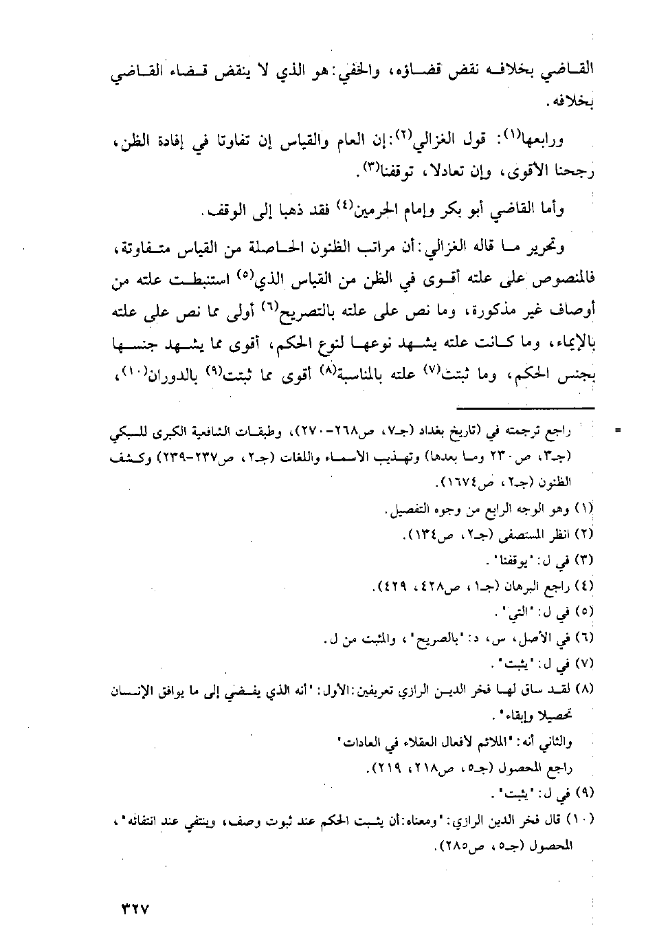 وتحرير ما قاله الغزالي: أن مراتب الظنون الحاصلة من القياس متفاوتة، فالمنصوص على علته أقوى في الظن من القياس الذي استنبطت علته من أوصاف غير مذكورة، وما نص على علته بالتصريح أولى مما نصل على علته بالإيماء، وما كانت علته يشهد نوعها لنوع الحكم، أقوى مما يشهد جنسها بجنس الحكم، وما ثبتت علته بالمناسبة أقوى مما ثبتت بالدوران،