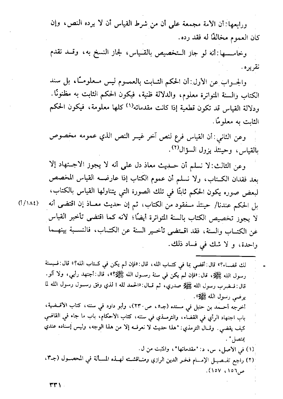 والجواب عن الأول: أن الحكم الثابت بالعموم ليس معلومًا، بل سند الكتاب والسنة المتواترة معلوم، والدلالة ظنية، فيكون الحكم الثابت به مظنونًا. ودلالة القياس قد تكون قطعية إذا كانت مقدماته كلها معلومة، فيكون الحكم الثابت به معلومًا.