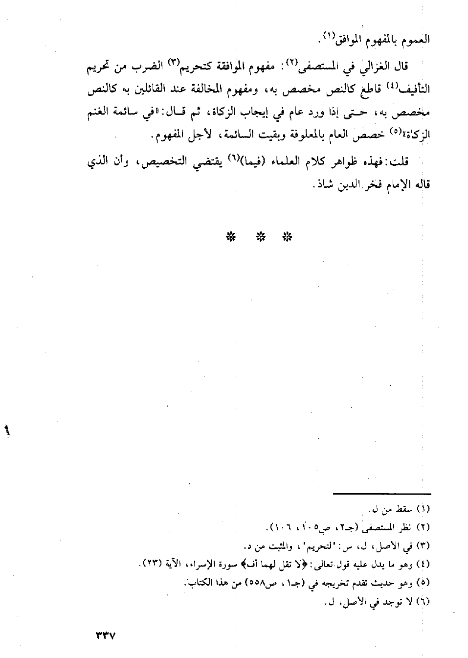 قال الغزالي في المستصفى: مفهوم الموافقة كتحريم الضرب من تحريم التأفيف قاطع كالنص مخصص به، ومفهوم المخالفة عند القائلين به كالنص مخصص به، حتى إذا ورد عام في إيجاب الزكاة، ثم قال: (في سائمة الغنم الزكاة) خصص العام بالمعلوفة وبقيت السائمة، لأجل المفهوم.