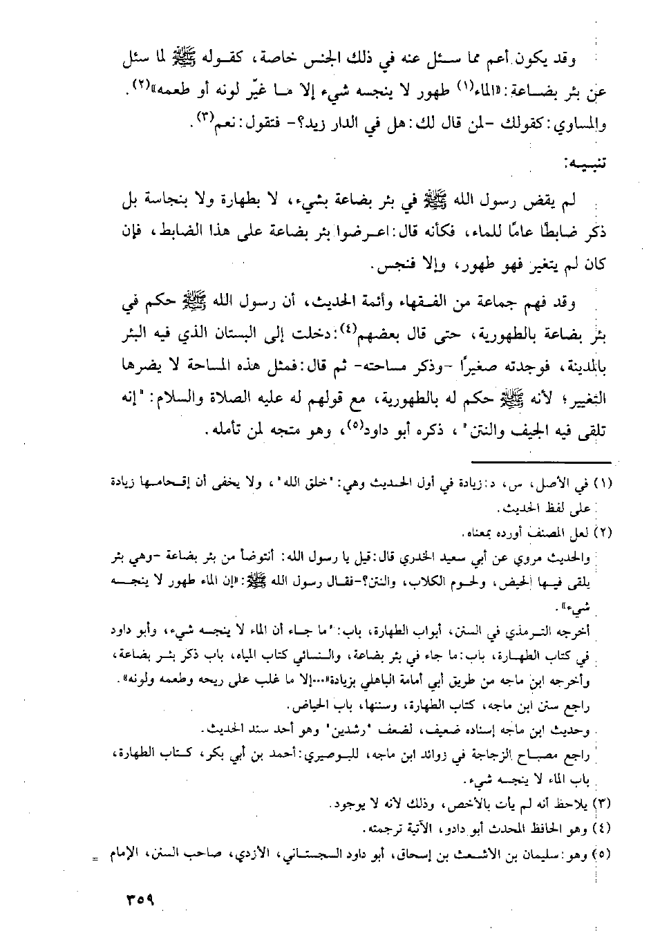 وقد فهم جماعة من الفقهاء وأئمة الحديث، أن رسول الله - صلى الله عليه وسلم - حكم في بئر بضاعة بالطهورية، حتى قال بعضهم: دخلت على البستان الذي فيه البئر بالمدينة، فوجدته صغيرًا- وذكر مساحته- ثم قال: فمثل هذه المساحة لا يضرها التغيير؛ لأنه - صلى الله عليه وسلم - حكم له بالطهورية، مع قولهم له عليه الصلاة والسلام: (إنه تلقى فيه الجيف والنتن)، ذكره أبو داود، وهو متجه لمن تأمله.