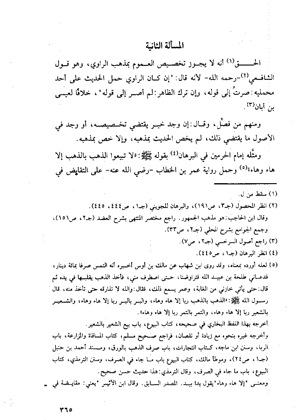 ومثله إمام الحرمين في البرهان بقوله - صلى الله عليه وسلم -: (لا تبيعوا الذهب بالذهب إلا هاء وهاء) وحمل رواية عمر بن الخطاب -رضي الله عنه- على التقابض في