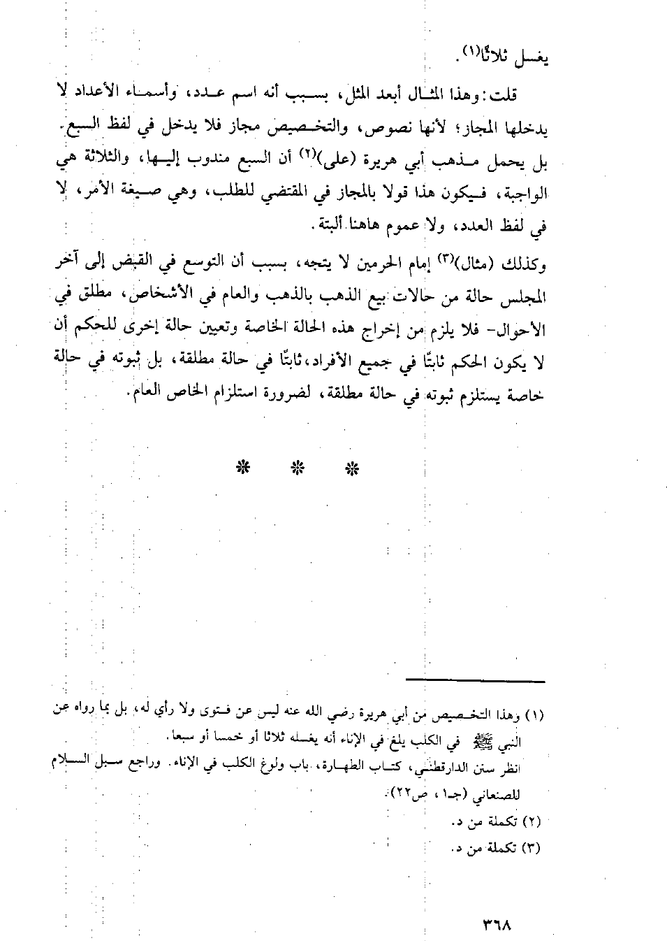 قلت: وهذا المثال أبعد المثل، بسبب أنه اسم عدد، وأسماء الأعداد لا يدخلها المجاز، لأنها نصوص، والتخصيص مجاز فلا يدخل في لفظ السبع بل يحمل مذهب أبي هريرة (على) أن السبع مندوب إليها، والثلاثة هي الواجبة، فيكون هذا قولا بالمجاز في المقتضي للطلب، وهي صيغة الأمر، لا في لفظ العدد، ولا عموم هاهنا البتة.