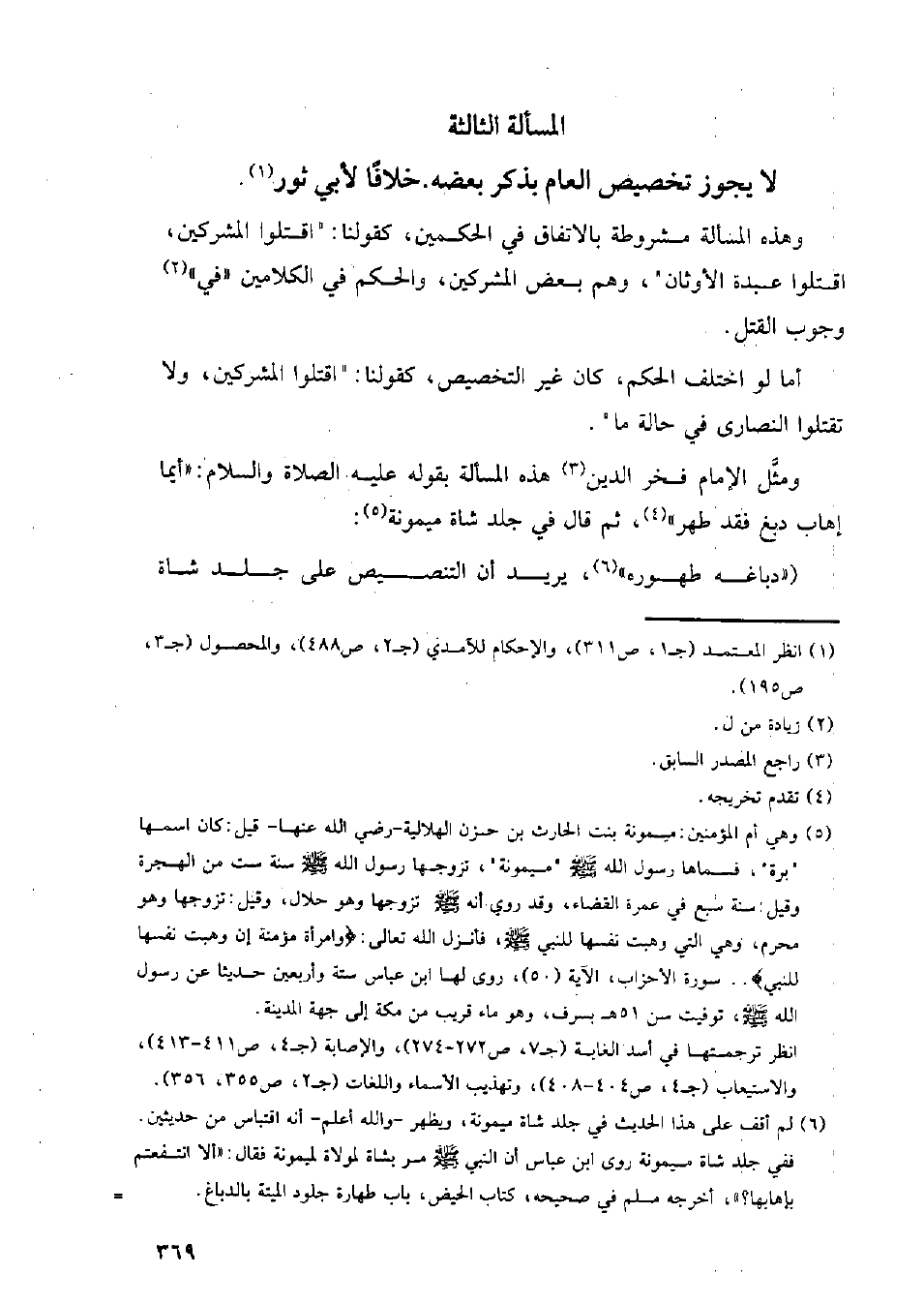 ومثل الإمام فخر الدين هذه المسألة بقوله عليه الصلاة والسلام: (أيما إهاب دبغ فقد طهر)، ثم قال في جلد شاة ميمونة: