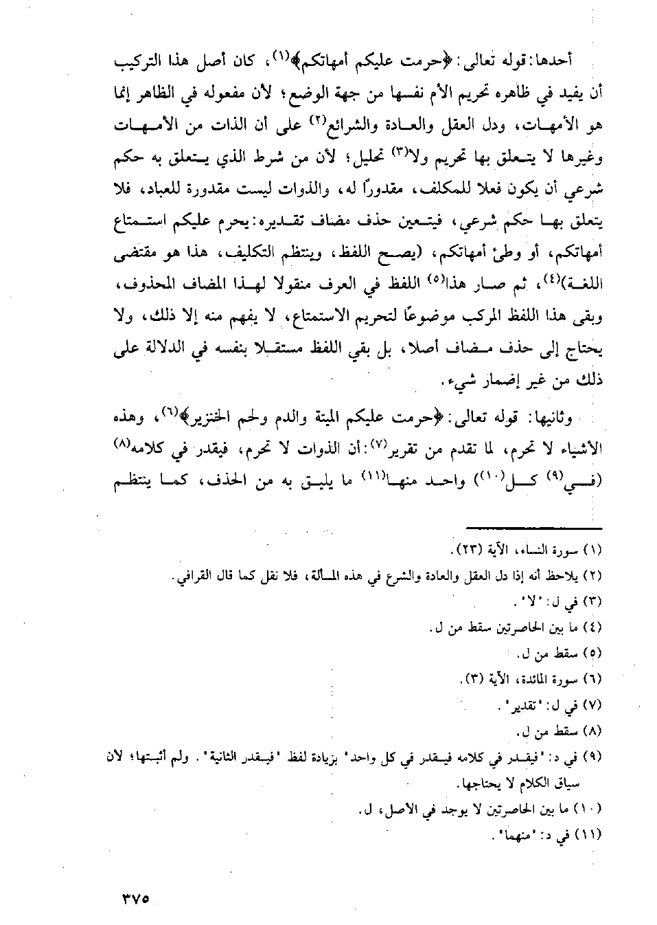 أحدها: قوله تعالى: {حرمت عليكم أمهاتكم}، كان أصل هذا التركيب أن يفيد في ظاهرة تحريم الأم نفسها من جهة الوضع؛ لأن مفعوله في الظاهر إنما هو الأمهات، ودل العقل والعادة والشرائع على أن الذات من الأمهات وغيرها لا يتعلق بها تحريم ولا تحليل؛ لأن من شرط الذي يتعلق به حكم شرعي أن يكون فعلا للمكلف، مقدورًا له، والذوات ليست مقدورة للعباد، فلا يتعلق بها حكم شرعي، فيتعين حذف مضاف تقديره: يحرم عليكم استمتاع أمهاتكم، أو وطئ أمهاتكم، (يصح اللفظ، وينتظم التكليف، هذا هو مقتضى اللغة)، ثم صار هذا اللفظ في العرف منقولا لهذا المضاف المحذوف، وبقى هذا اللفظ المركب موضوعًا لتحريم الاستمتاع، لا يفهم منه إلا ذلك، ولا يحتاج إلى حذف مضاف أصلا، بل بقي اللفظ مستقبلا بنفسه في الدلالة على ذلك من غير إضمار شيء.