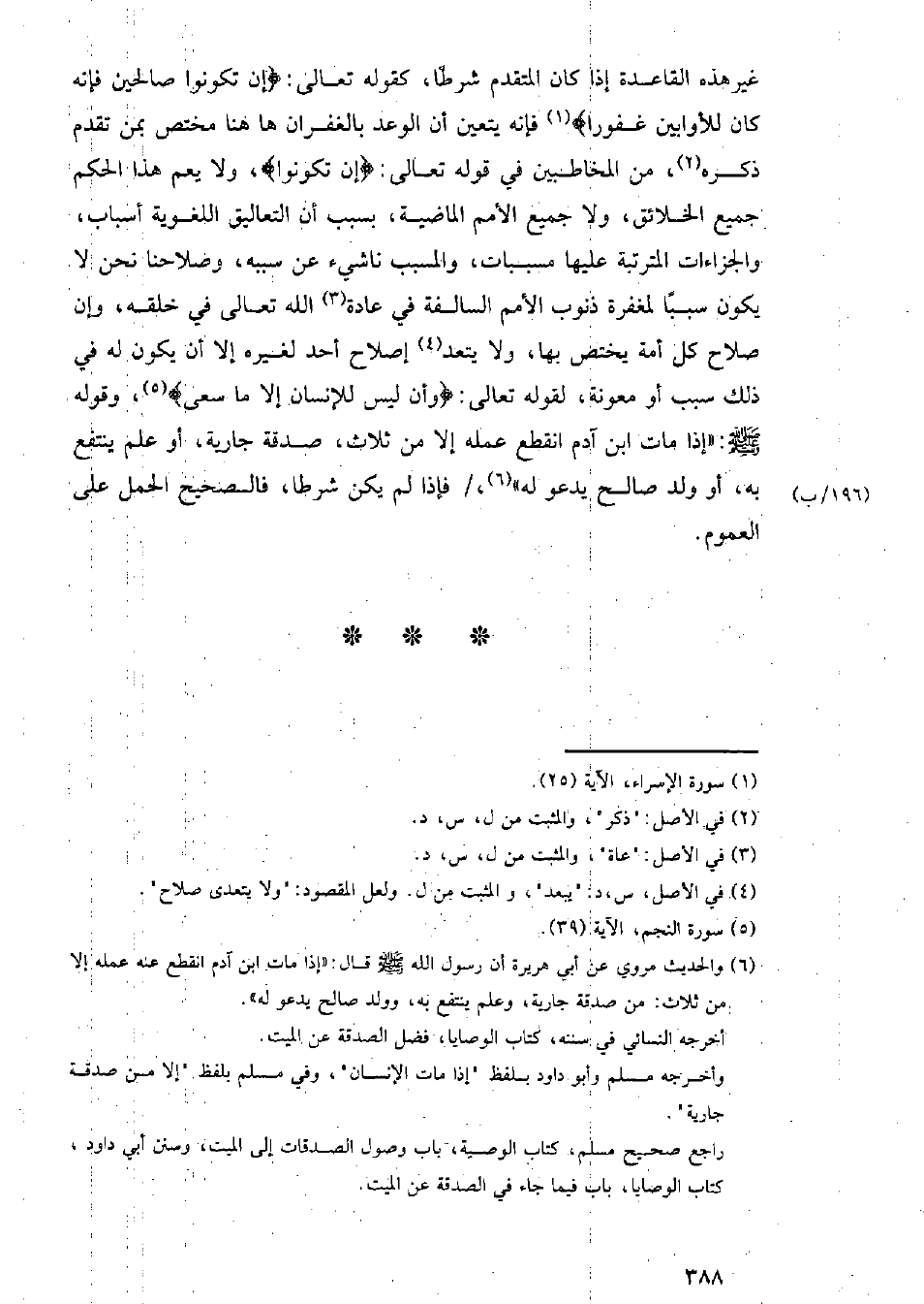 غير هذه القاعدة إذا كان المتقدم شرطًا, كقوله تعالى: {إن تكونوا صالحين فإنه كان للأوابين غفورا} فإنه يتعين أن الوعد بالغفران هاهنا مختص بمن تقدم ذكره, من المخاطبين في قوله تعالى: {إن تكونوا} , ولا يعم هذا الحكم جميع الخلائق, ولا جميع الأمم الماضية, بسبب أن التعاليق اللغوية أسباب, والجزاءات المترتبة عليها مسببات, والمسبب ناشئ عن سببه, وصلاحنا نحن لا يكون سببًا لمغفرة ذنوب الأمم السالفة في عادة الله تعالى في خلقه, وإن صلاح كل أمة يختص بها, ولا يتعد إصلاح أحد لغيره إلا أن يكون له في ذلك سبب أو معونة, لقوله تعالى: {وأن ليس للإنسان إلا ما سعى} , وقوله - صلى الله عليه وسلم - (إذا مات ابن آدم انقطع عمله إلا من ثلاث, صدقة جارية , أو علم ينتفع به, أو ولد صالح يدعو له, فإذا لم يكن شرطا, فالصحيح الحمل على العموم.