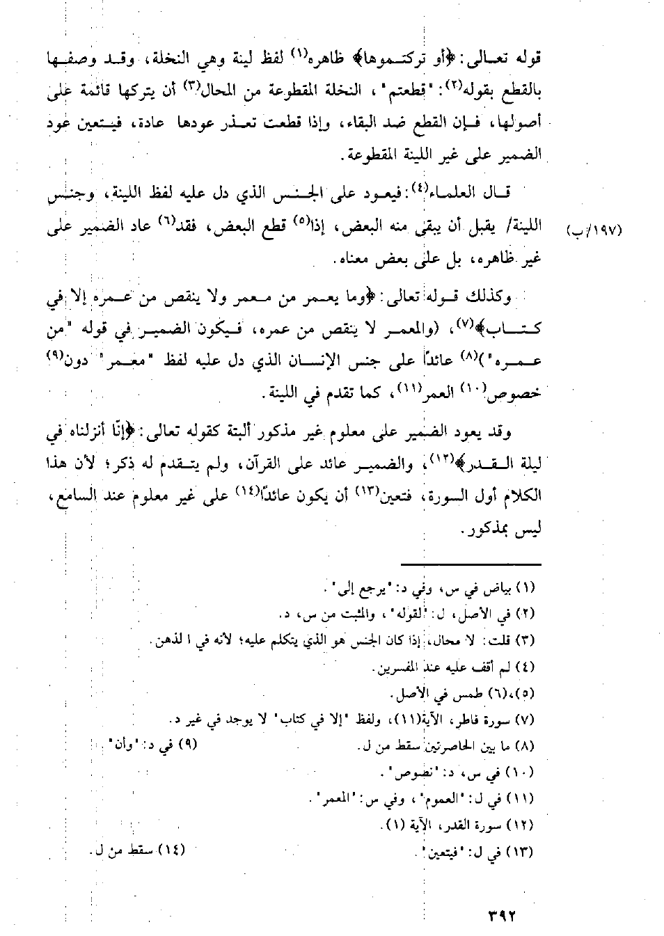 وكذلك قوله تعالى: {وما يعمر من معمر ولا ينقص من عمره إلا في كتاب}، (والمعمر لا ينقص من عمره، فيكون الضمير في قوله (من عمره) عائدًا على جنس الإنسان الذي دل عليه لفظ (معمر) دون خصوص العمر، كما تقدم في اللينة.