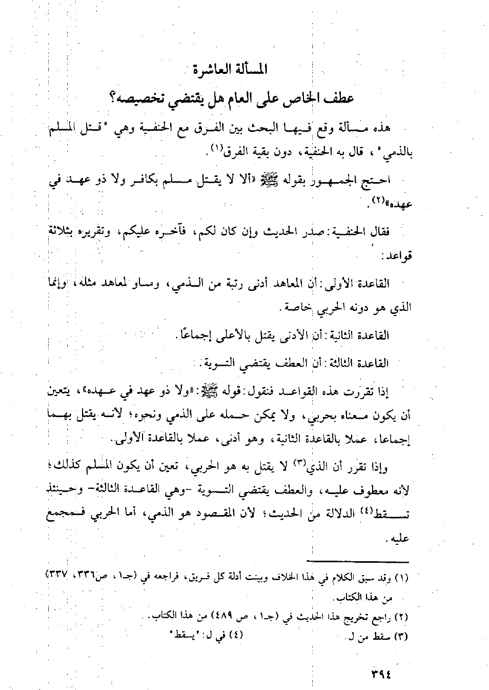 وإذا تقرر أن الذي لا يقتل به هو الحربي، تعين أن يكون المسلم كذلك؛ لأنه معطوف عليه، والعطف يقتضي التسوية- وهي القاعدة الثالثة- وحينئذ تسقط الدلالة من الحديث؛ لأن المقصود هو الذمي، أما الحربي فمجمع عليه.