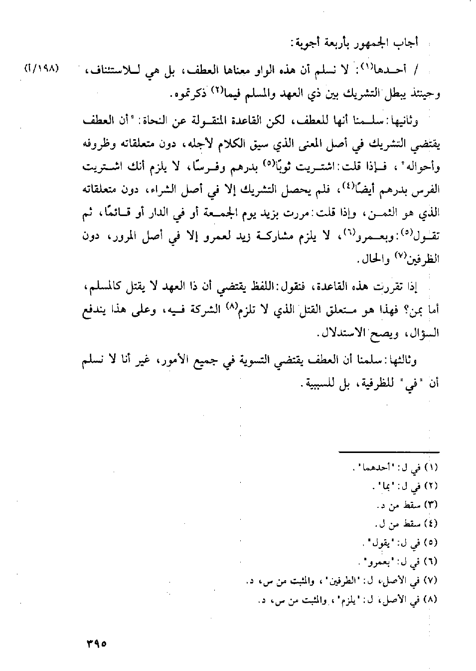 وثانيها: سلمنا أنها للعطف، لكن القاعدة المنقولة عن النحاة: (أن العطف يقتضي التشريك في أصل المعنى الذي سيق الكلام لأجله، دون متعلقاته وظروفه وأحواله، فإذا قلت: اشتريت ثوبًا بدرهم وفرسًا، لا يلزم أنك اشتريت