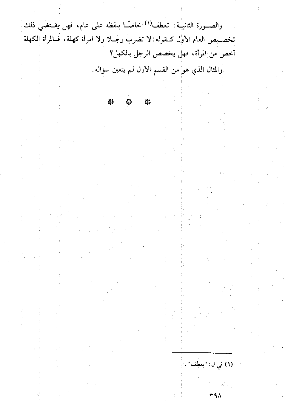 والصورة الثانية: تعطف خاصًا بلفظه على عام، فهل يقتضي ذلك تخصيص العام الأول كقوله: لا تضرب رجلا ولا امرأة كهلة، فالمرأة الكهلة أخص من المرأة، فهل يخصص الرجل بالكهل؟