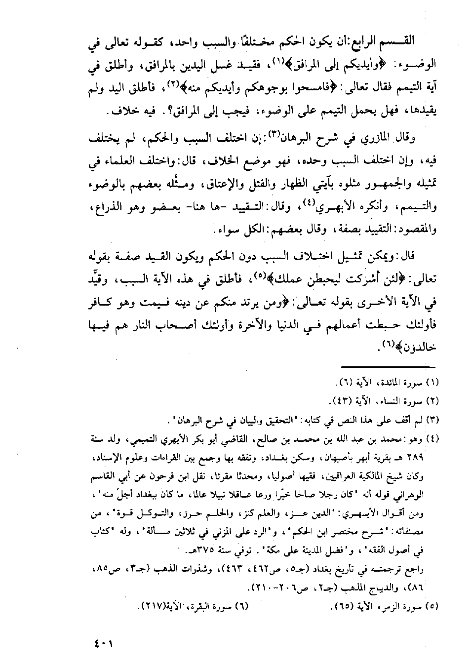 القسم الرابع: أن يكون الحكم مختلفًا والسبب واحد، كقوله تعالى في الوضوء: {وأيديكم إلى المرافق}، فقيد غسل اليدين بالمرافق، وأطلق في آية التيمم فقال تعالى: {فامسحوا بوجوهكم وأيديكم منه}، فأطلق اليد ولم يقيدها، فهل يحمل التيمم على الوضوء، فيجب إلى المرافق؟ . فيه خلاف.