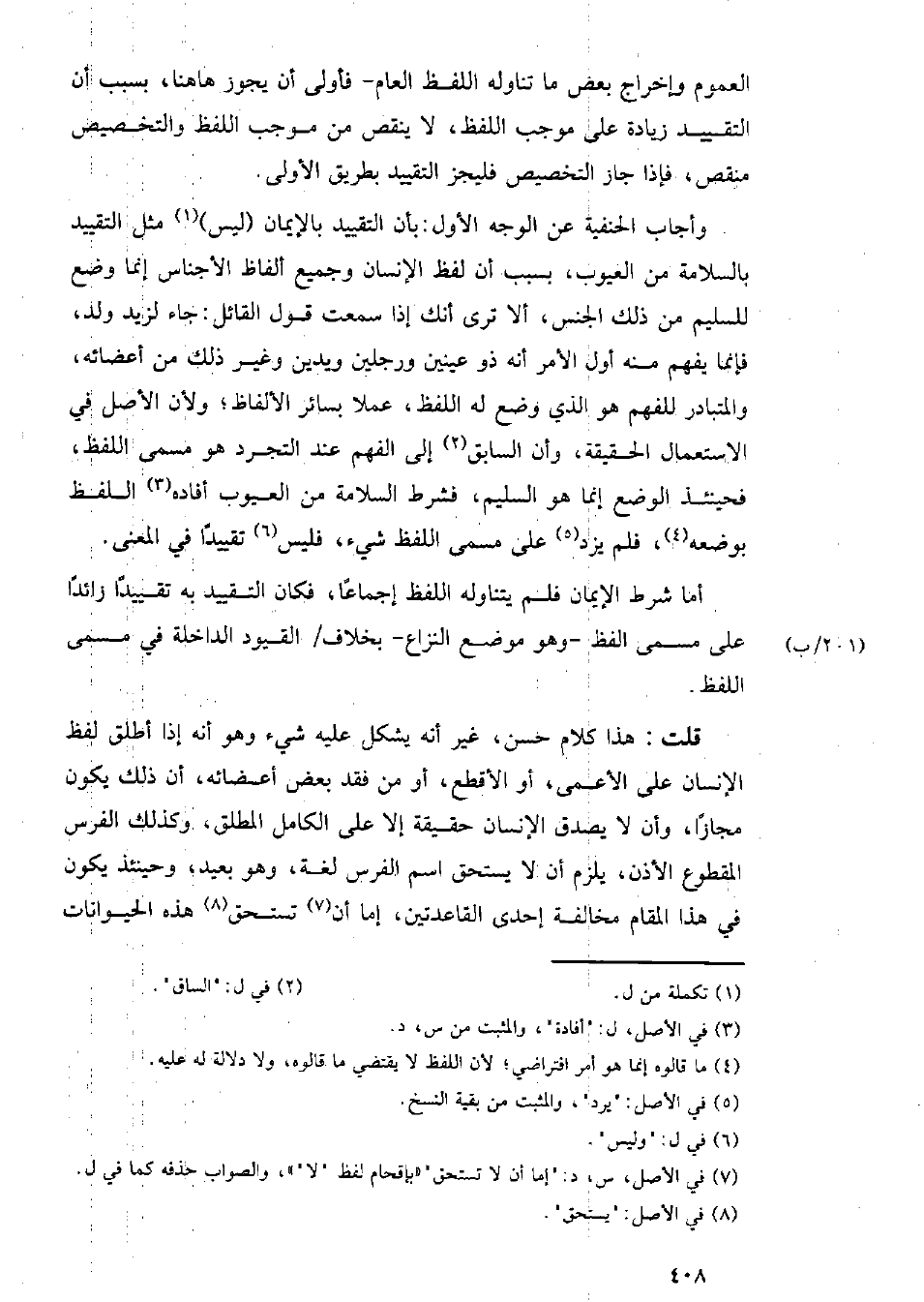 وأجاب الحنفية عن الوجه الأول: بأن التقييد بالإيمان (ليس) مثل التقييد بالسلامة من الغيوب، بسبب أن لفظ الإنسان وجميع ألفاظ الأجناب إنما وضع للسليم من ذلك الجنس، ألا ترى أنك إذا سمعت قول القائل: جاء لزيد ولد، فإنما يفهم منه أول الأمر أنه ذو عينين ورجلين ويدين وغير ذلك من أعضائه، والمتبادر للفهم هو الذي وضع له اللفظ، عملا بسائر الألفاظ؛ ولأن الأصل في الاستعمال الحقيقة، وأن السابق إلى الفهم عند التجرد هو مسمى اللفظ، فحينئذ الوضع إنما هو السليم، فشرط السلامة من العيوب أفاده اللفظ بوضعه، فلم يزد على مسمى اللفظ شيء، فليس تقييدًا في المعنى.