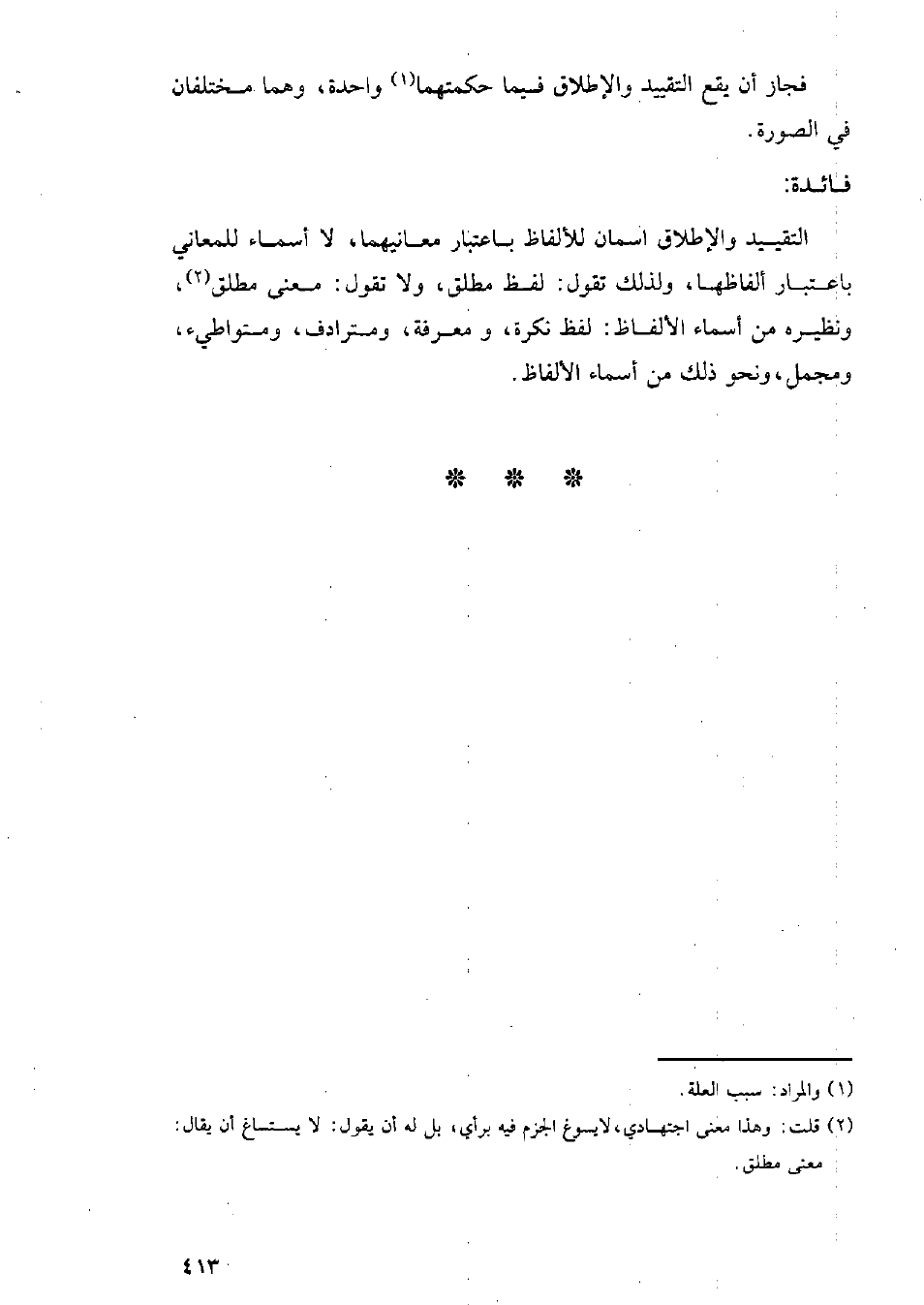فائدة: التقييد والإطلاق اسمان للألفاظ باعتبار معانيهما، لا أسماء للمعاني باعتبار ألفاظها، ولذلك تقول: لفظ مطلق، ولا تقول: معنى مطلق، ونظيره من أسماء الألفاظ: لفظ نكرة، ومعرفة، ومترادف، ومتواطئ، ومجمل، ونحو ذلك من أسماء الألفاظ.