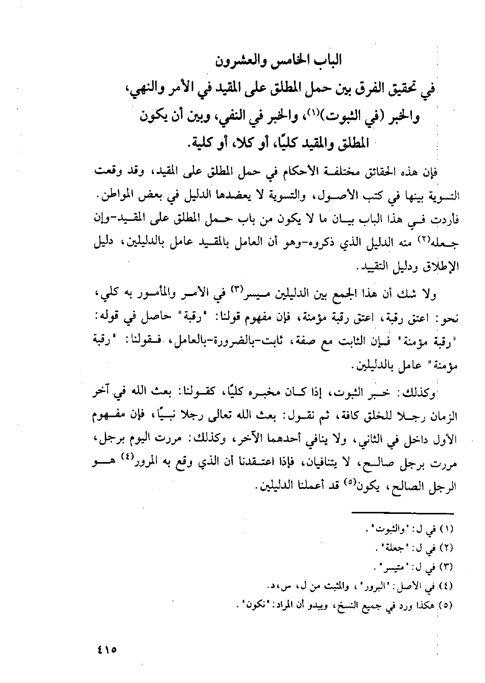 الباب الخامس والعشرون في تحقيق الفرق بين حمل المطلق على المقيد في الأمر والنهي، والخبر (في الثبوت)، والخبر في النفي، وبين أن يكون المطلق والمقيد كليًا، أو كلا، أو كلية.