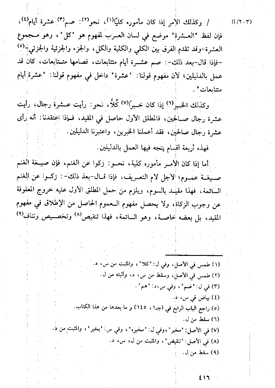 وكذلك الأمر إذا كان مأموره كليًا، نحو: صم عشرة أيام، فإن لفظ (العشرة) موضع في لسان العرب لمفهوم هو (كل)، وهو مجموع العشرة- وقد تقدم الفرق بين الكلي والكلية والكل، والجزء والجزئية والجزئي- فإذا قال- بعد ذلك-: صم عشرة أيام متتابعات، فصامها متتابعات، كان قد عمل بالدليلين؛ لأن مفهوم قولنا: (عشرة) داخل في مفهوم قولنا: (عشرة أيام متتابعات).