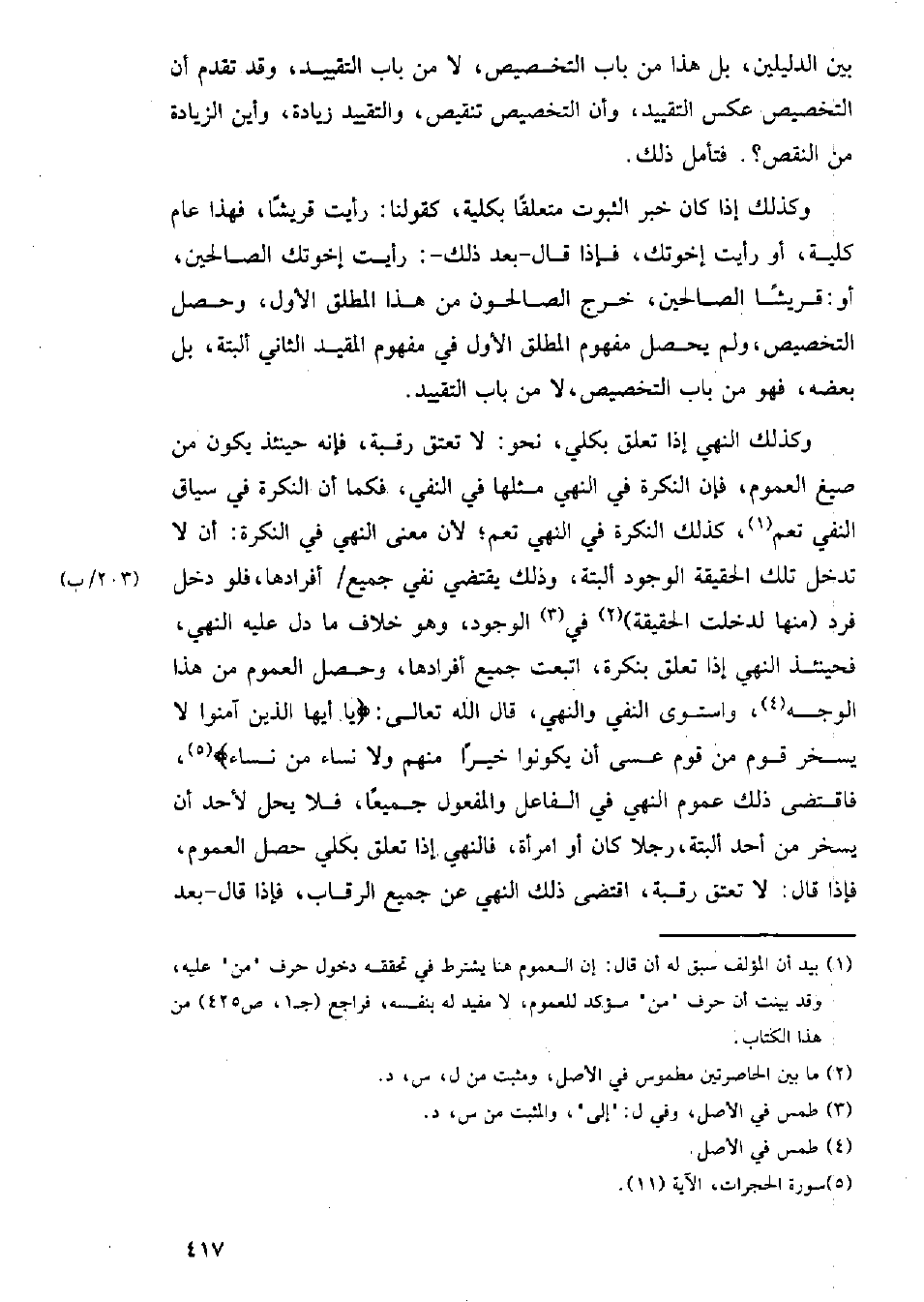 وكذلك إذا كان خبر الثبوت متعلقًا بكلية، كقولنا: رأيت قريشًا، فهذا عام كلية، أو رأيت إخوتك، فإذا قال- بعد ذلك-: رأيت إخوتك الصالحين، أو: قريشًا الصالحين، خرج الصالحون من هذا المطلق الأول، وحصل التخصيص، ولم يحصل مفهوم المطلق الأول في مفهوم المقيد الثاني البتة، بل بعضه، فهو من باب التخصيص، لا من باب التقييد.