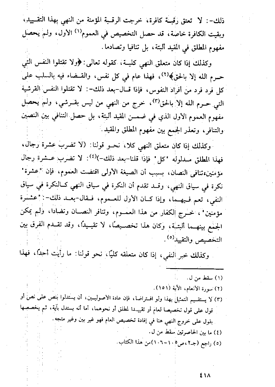 وكذلك إذا كان متعلق النهي كلية، كقوله تعالى: {ولا تقتلوا النفس التي حرم الله إلا بالحق}، فهذا عام في كل نفس، والقضاء فيه بالسلب على كل فرد فرد من أفراد النفوس، فإذا قال- بعد ذلك-: لا تقتلوا النفس القرشية التي حرم الله إلا بالحق، خرج من النهي من ليس بقرشي، ولم يحصل مفهوم العموم الأول الذي في ضمن المقيد البتة، بل حصل التنافي بين النصين والتنافر، وتعذر الجمع بين مفهوم المطلق والمقيد.