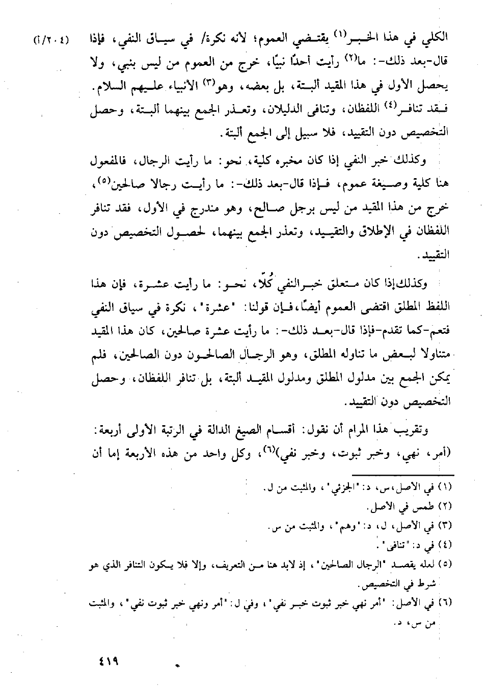 الكلي في هذا الخبر يقتضي العموم؛ لأنه نكرة في سياق النفي، فإذا قال- بعد ذلك-: ما رأيت أحدًا نبيًا، خرج من العموم من ليس بنبي، ولا يحصل الأول في هذا المقيد البتة، بل بعضه، وهو الأنبياء عليهم السلام. فقد تنافر اللفظان، وتنافى الدليلان، وتعذر الجمع بينهما البتة، وحصل التخصيص دون التقييد، فلا سبيل إلى الجمع البتة.