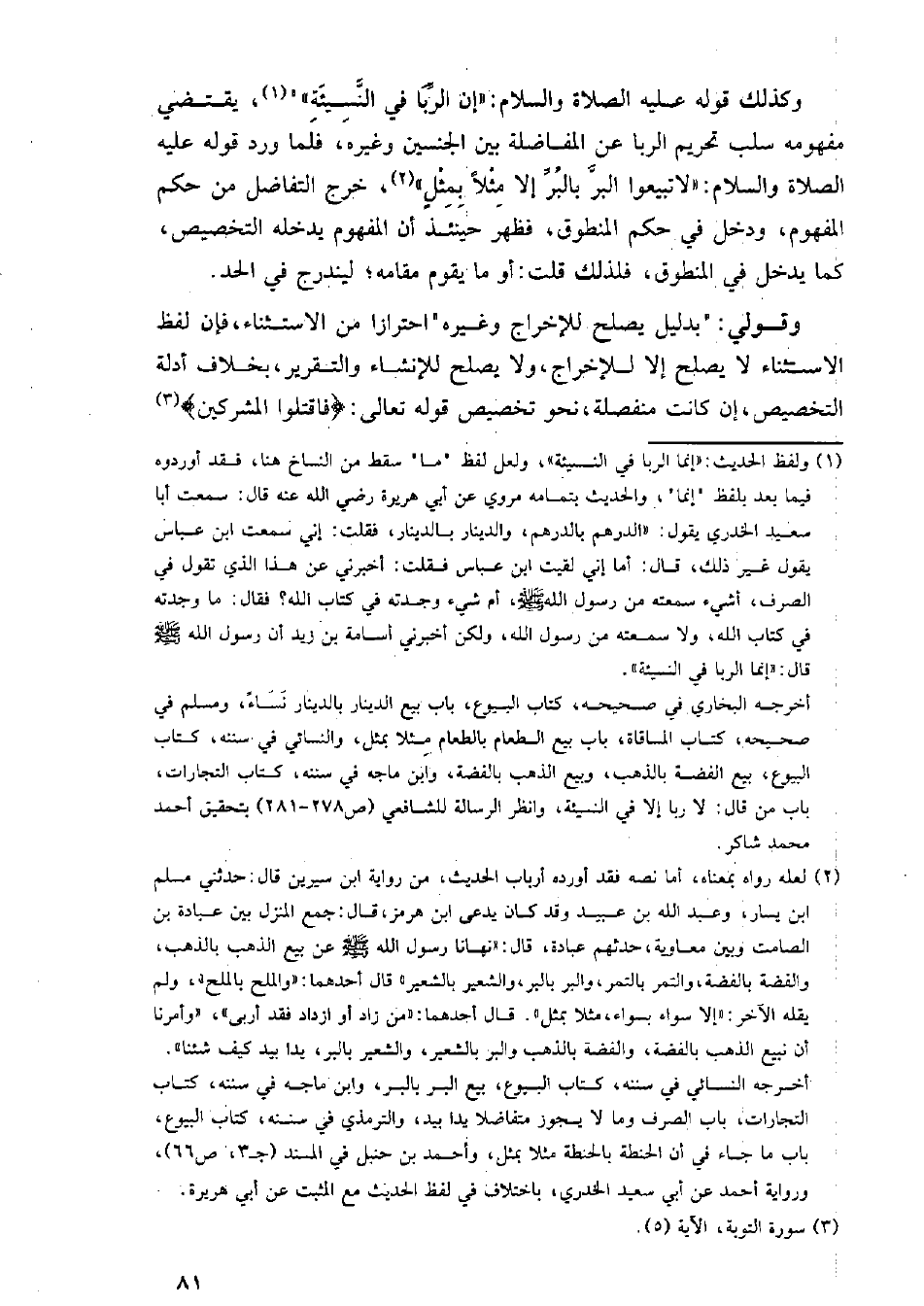 وكذلك قوله عليه الصلاة والسلام: "إن الربا في النسيئة"، يقتضي مفهومه سلب تحريم الربا عن المفاضلة بين الجنسين وغيره، فلما ورد قوله عليه الصلاة والسلام: "لا تبيعوا البر بالبر إلا مثلًا بمثل"، خرج التفاضل من حكم المفهوم، ودخل في حكم المنطوق، فظهر حينئذ أن المفهوم يدخله التخصيص، كما يدخل في المنطوق، فذلك قلت: أو ما يقوم مقامه؛ ليندرج في الحد.