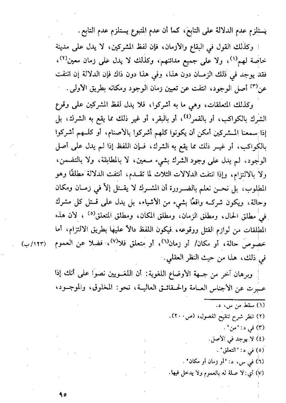 وكذلك المتعلقات، وهي ما به أشركوا، فلا يدل لفظ المشركين على وقوع الشرك بالكواكب، أو بالقمر، أو بالبقر، أو غير ذلك مما يقع به الشرك، بل إذا سمعنا المشركين أمكن أن يكونوا كلهم أشركوا بالأصنام، أو كلهم أشركوا بالكواكب، أو غير ذلك مما يقع به الشرك، فإن اللفظ إذا لم يدل على أصل الوجود، لم يدل على وجود الشرك بشيء معين، لا بالمطابقة، ولا بالتضمن، ولا بالالتزام، وإذا انتفت الدلالات الثلاث لما تقدم، انتفت الدلالة مطلقًا وهو المطلوب، بل نحن نعلم بالضرورة أن المشرك لا يقتل إلا في زمان ومكان وحالة، ويكون شركه واقعًا بشيء من الأشياء، بل يدل لا على قتل كل مشرك في مطلق الحال، ومطلق الزمان، ومطلق المكان، ومطلق المتعلق، لأن هذه المطلقات من لوازم القتل ووقوعه، فيكون اللفظ دالًا عليها بطريق الالتزام، أما خصوص حالة، أو مكان / أو زمان، أو متعلق فلا، فضلًا عن العموم في ذلك، هذا من حيث النظر العقلي.