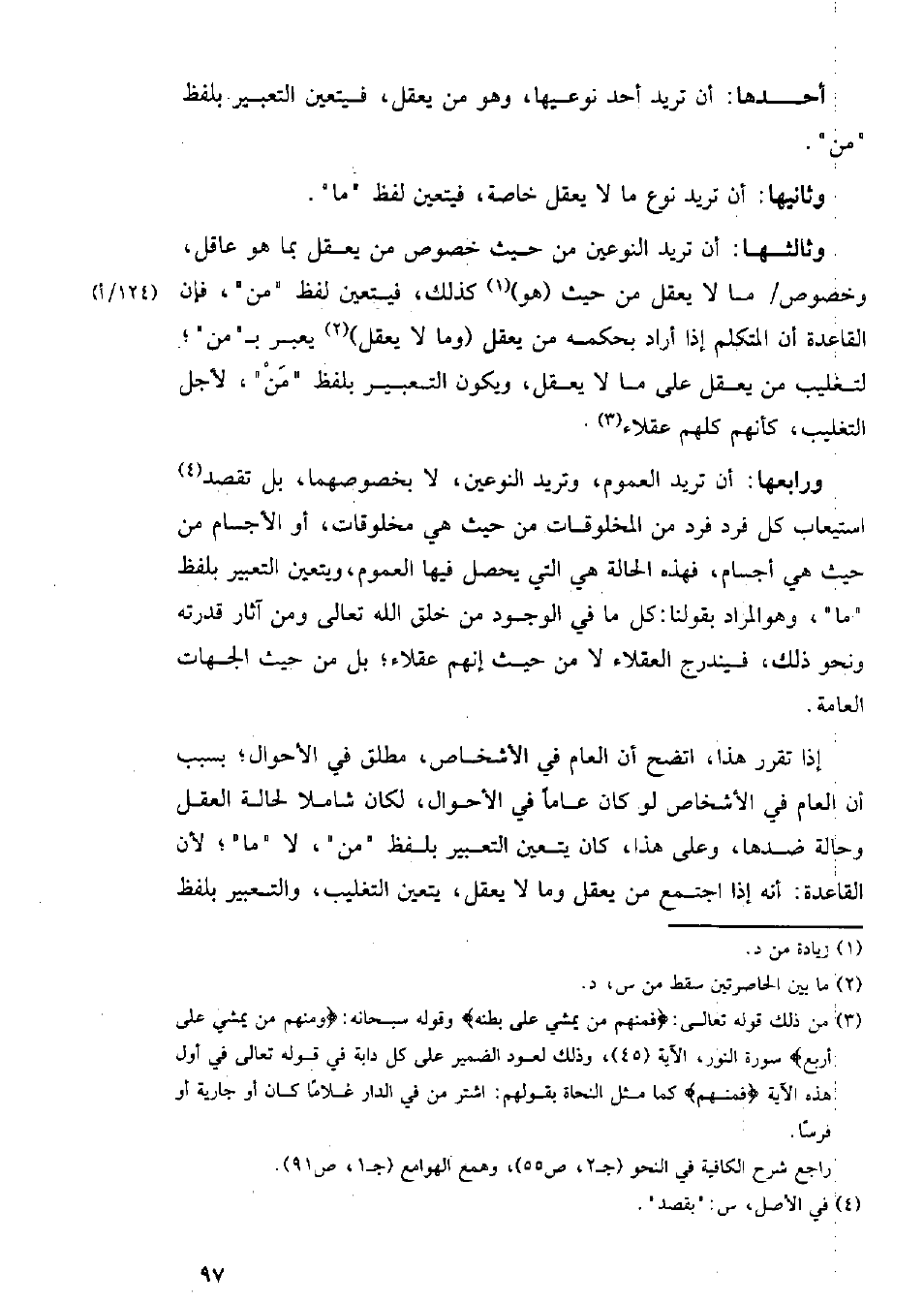 ورابعها: أن تريد العموم، وتريد النوعين، لا بخصوصهما، بل تقصد استيعاب كل فرد فرد من المخلوقات من حيث هي مخلوقات، أو الأجسام من حيث هي أجسام، فهذه الحالة هي التي يحصل فيها العموم، ويتعين التعبير بلفظ "ما"، وهو المراد بقولنا: كل ما في الوجود من خلق الله تعالى ومن آثار قدرته ونحو ذلك، فيندرج العقلاء لا من حيث إنهم عقلاء؛ بل من حيث الجهات العامة.