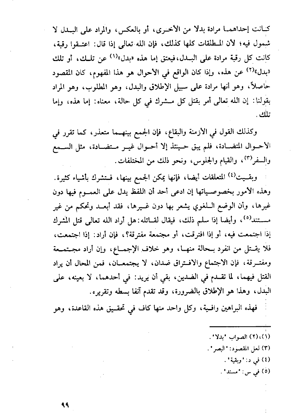 وبقيت المتعلقات أيضًا، فإنها يمكن الجمع بينها، فتشرك بأشياء كثيرة. وهذه الأمور بخصوصياتها إن ادعى أحد أن اللفظ يدل على العموم فيها دون غيرها، وأن الوضع اللغوي يشعر بها دون غيرها، فقد أبعد وتحكم من غير مستند، وأيضًا إذا سلم ذلك، فيقال لقائله: هل أرد الله تعالى قتل المشرك إذا اجتمعت فيه، أو إذا افترقت، أو مجتمعة مفترقة؟ ، فإن أراد: إذا اجتمعت، فلا يقتل من انفرد بحالة منها، وهو خلاف الإجماع، وإن أراد مجتمعة ومفترقة، فإن الاجتماع والافتراق ضدان، لا يجتمعان، فمن المحال أن يراد القتل فيهما، لما تقدم في الضدين، بقي أن يريد: في أحدهما، لا بعينه، على البدل، وهذا هو الإطلاق بالضرورة، وقد تقدم آنفًا بسطه وتقريره.