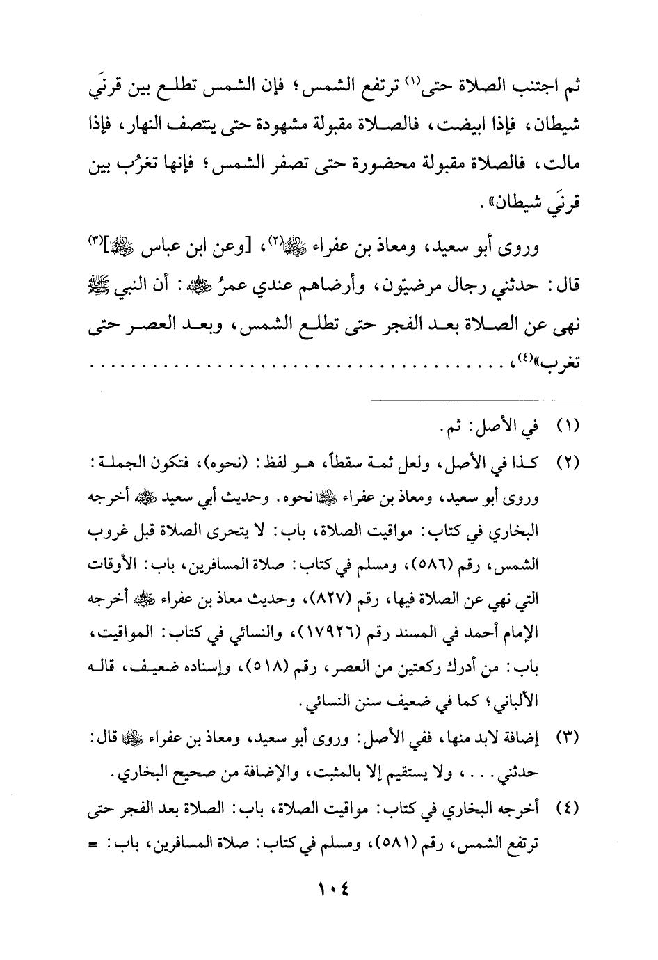 (¬2) كذا في الأصل، ولعل ثمة سقطًا، هو لفظ: (نحوه)، فتكون الجملة: وروى أبو سعيد، ومعاذ بن عفراء - رضي الله عنهما - نحوه. وحديث أبي سعيد - رضي الله عنه - أخرجه البخاري في كتاب: مواقيت الصلاة، باب: لا يتحرى الصلاة قبل غروب الشمس، رقم (586)، ومسلم في كتاب: صلاة المسافرين، باب: الأوقات التي نهي عن الصلاة فيها، رقم (827)، وحديث معاذ بن عفراء - رضي الله عنه - أخرجه الإمام أحمد في المسند رقم (17926)، والنسائي في كتاب: المواقيت، باب: من أدرك ركعتين من العصر، رقم (518)، وإسناده ضعيف، قاله الألباني؛ كما في ضعيف سنن النسائي.