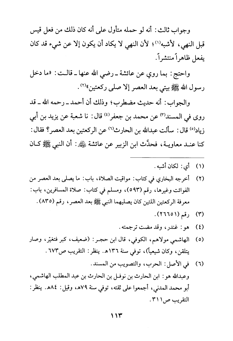 والجواب: أنه حديث مضطرب؛ وذلك أن أحمد - رحمه الله - قد روى في المسند (¬3) عن محمد بن جعفر (¬4) قال: نا شعبة عن يزيد بن أبي زياد (¬5) قال: سألت عبد الله بن الحارث (¬6) عن الركعتين بعد العصر؟ فقال: كنا عند معاوية، فحدَّث ابن الزبير عن عائشة - رضي الله عنهم -: أن النبي - صلى الله عليه وسلم - كان