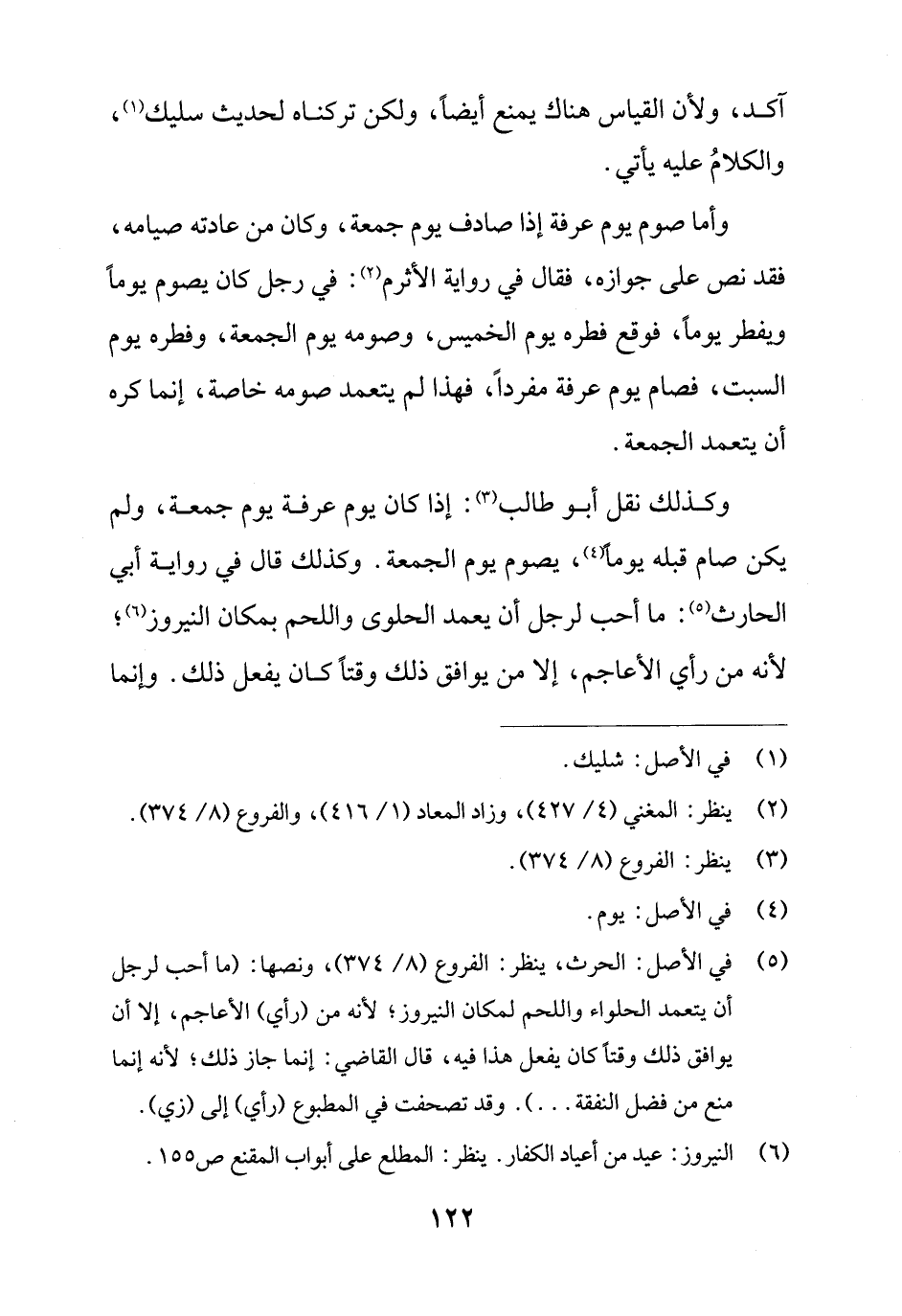 (¬5) في الأصل: الحرث، ينظر: الفروع (8/ 374)، ونصها: (ما أحب لرجل أن يتعمد الحلواء واللحم لمكان النيروز؛ لأنه من (رأي) الأعاجم، إلا أن يوافق ذلك وقتًا كان يفعل هذا فيه، قال القاضي: إنما جاز ذلك؛ لأنه إنما منع من فضل النفقة ... ). وقد تصحفت في المطبوع (رأي) إلى (زي).