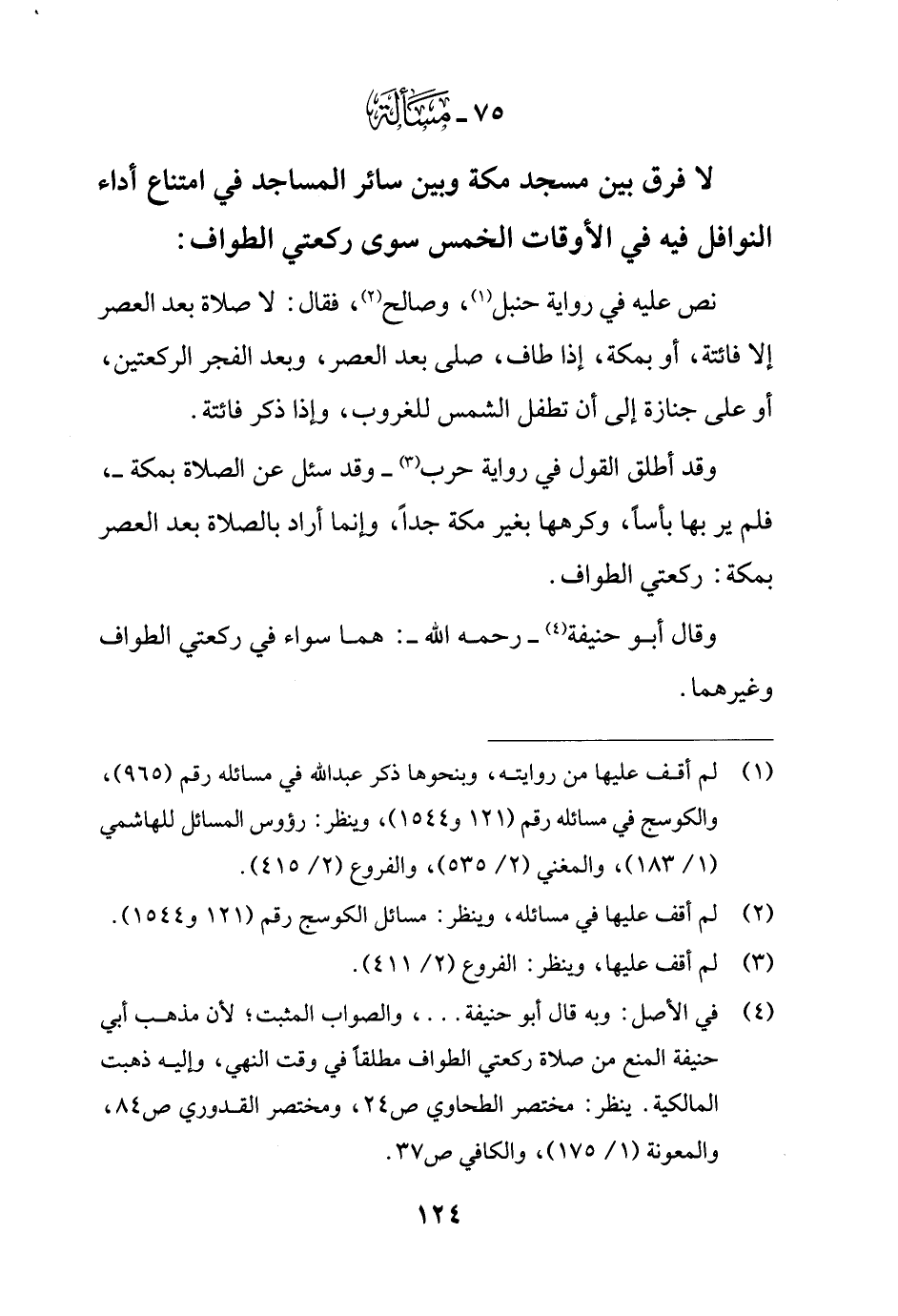 75 - مَسْألَة: لا فرق بين مسجد مكة وبين سائر المساجد في امتناع أداء النوافل فيه في الأوقات الخمس سوى ركعتي الطواف: