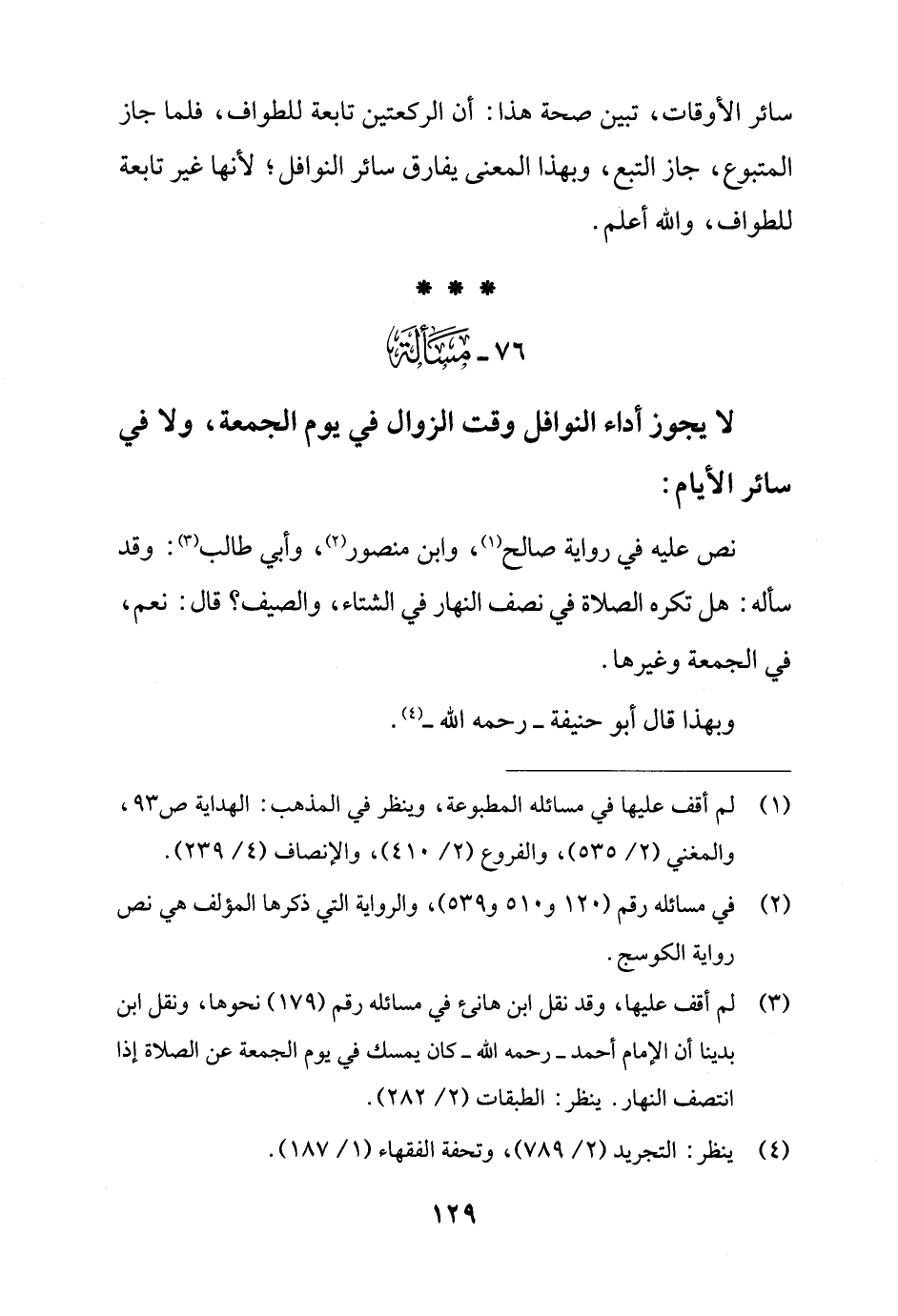 76 - مَسْألَة: لا يجوز أداء النوافل وقت الزوال في يوم الجمعة، ولا في سائر الأيام: