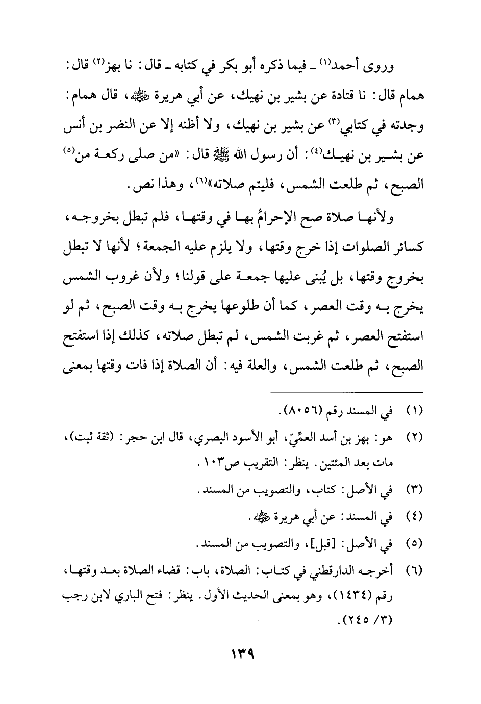 وروى أحمد (¬1) - فيما ذكره أبو بكر في كتابه - قال: نا بهز (¬2) قال: همام قال: نا قتادة عن بشير بن نهيك، عن أبي هريرة - رضي الله عنه -، قال همام: وجدته في كتابي (¬3) عن بشير بن نهيك، ولا أظنه إلا عن النضر بن أنس عن بشير بن نهيك (¬4): أن رسول الله - صلى الله عليه وسلم - قال: "من صلى ركعة من (¬5) الصبح، ثم طلعت الشمس، فليتم صلاته" (¬6)، وهذا نص.