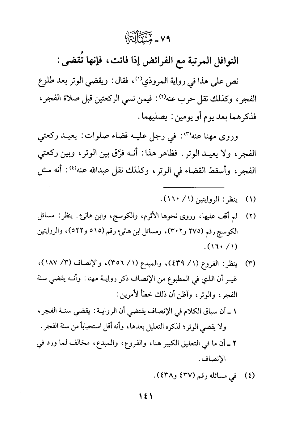 1 - أن سياق الكلام في الإنصاف يقتضي أن الرواية: يقضي سنة الفجر، ولا يقضي الوتر؛ لذكره التعليل بعدها، وأنه أقل استحبابًا من سنة الفجر.