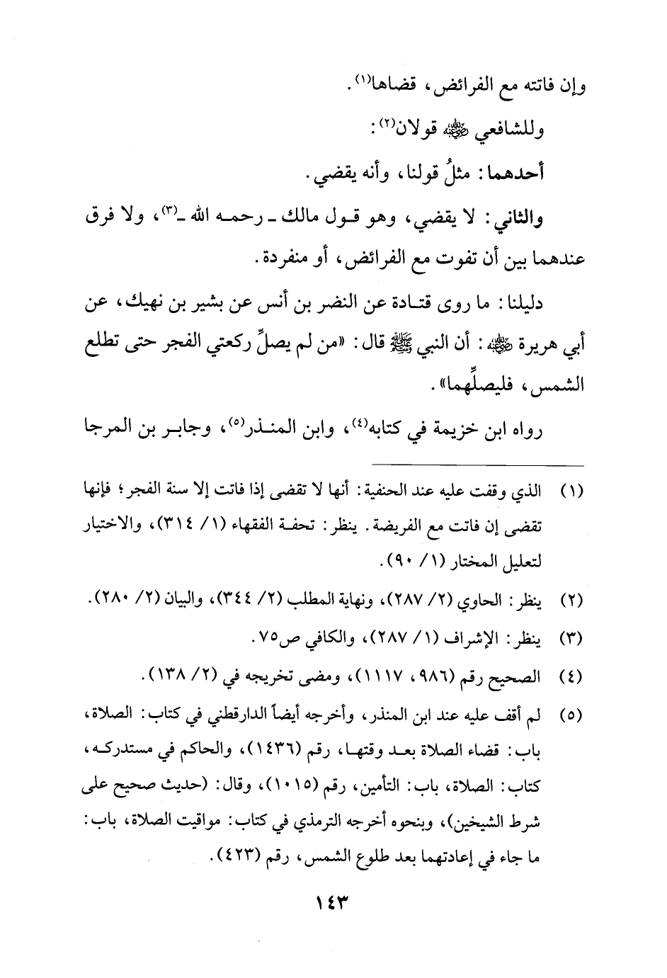 (¬1) الذي وقفت عليه عند الحنفية: أنها لا تقضي إذا فاتت إلا سنة الفجر؛ فإنها تقضى إن فاتت مع الفريضة. ينظر: تحفة الفقهاء (1/ 314)، والاختيار لتعليل المختار (1/ 90).