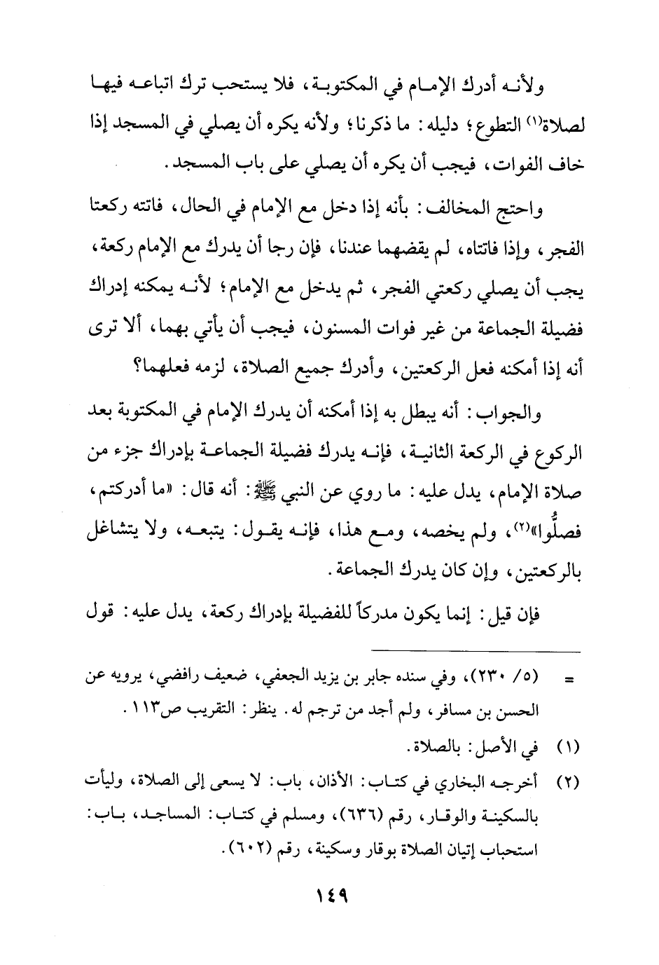 والجواب: أنه يبطل به إذا أمكنه أن يدرك الإمام في المكتوبة بعد الركوع في الركعة الثانية، فإنه يدرك فضيلة الجماعة بإدراك جزء من صلاة الإمام، يدل عليه: ما روي عن النبي - صلى الله عليه وسلم -: أنه قال: "ما أدركتم، فصلُّوا" (¬2)، ولم يخصه، ومع هذا، فإنه يقول: يتبعه، ولا يتشاغل بالركعتين، وإن كان يدرك الجماعة.