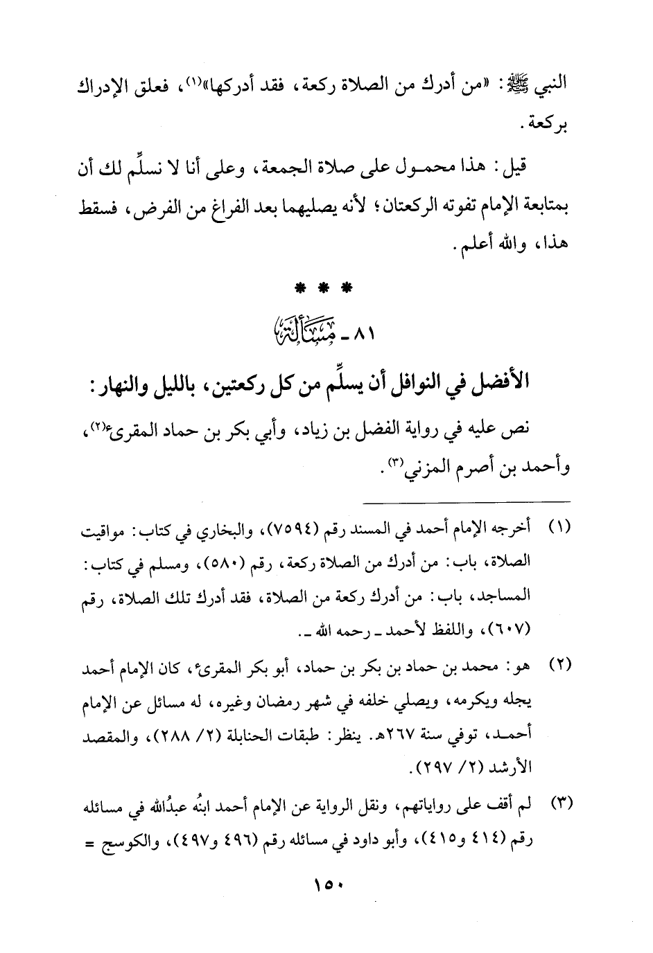 81 - مَسْألَة: الأفضل في النوافل أن يسلِّم من كل ركعتين، بالليل والنهار: