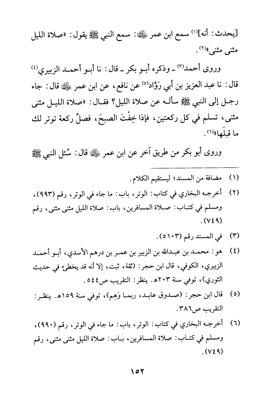 وروى أحمد (¬3) - وذكره أبو بكر - قال: نا أبو أحمد الزبيري (¬4) قال: نا عبد العزيز بن أبي رَوَّاد (¬5) عن نافع، عن ابن عمر - رضي الله عنهما - قال: جاء رجل إلي النبي - صلى الله عليه وسلم - سأله عن صلاة الليل؟ فقال: "صلاة الليل مثنى مثنى، تسلم في كل ركعتين، فإذا خِفْتَ الصبحَ، فصلِّ ركعة توتر لك ما قبلَها" (¬6).
