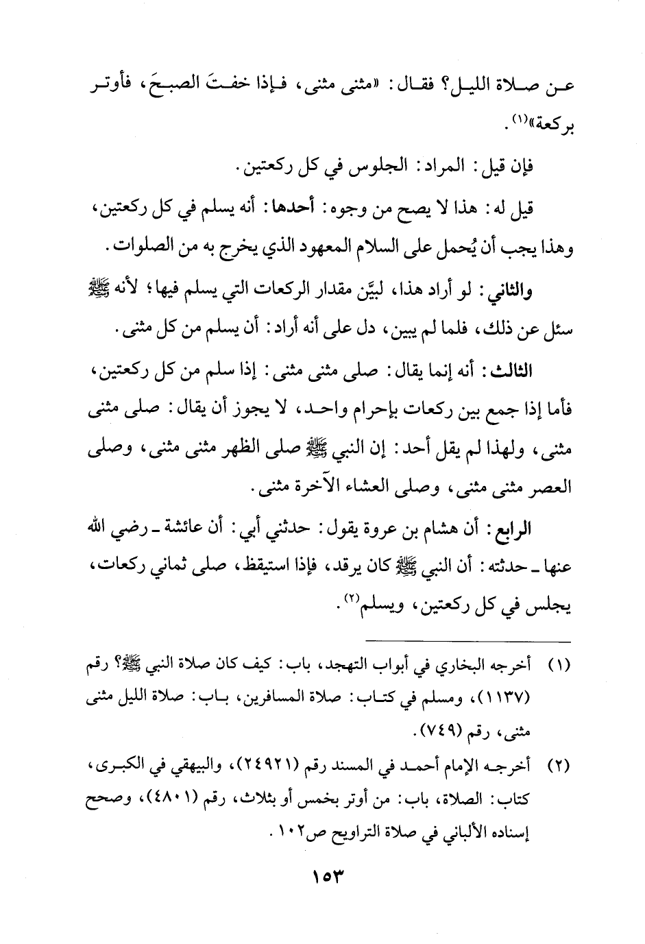والثاني: لو أراد هذا، لبيَّن مقدار الركعات التي يسلم فيها؛ لأنه - صلى الله عليه وسلم - سئل عن ذلك، فلما لم يبين، دل على أنه أراد: أن يسلم من كل مثنى.