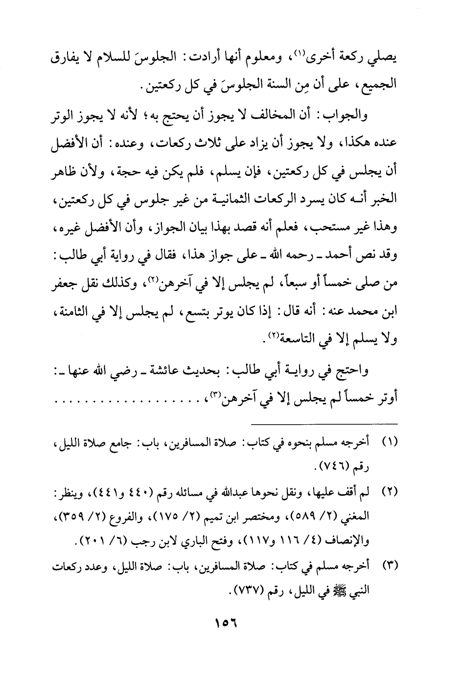 والجواب: أن المخالف لا يجوز أن يحتج به؛ لأنه لا يجوز الوتر عنده هكذا، ولا يجوز أن يزاد على ثلاث ركعات، وعنده: أن الأفضل أن يجلس في كل ركعتين، فإن يسلم، فلم يكن فيه حجة، ولأن ظاهر الخبر أنه كان يسرد الركعات الثمانية من غير جلوس في كل ركعتين، وهذا غير مستحب، فعلم أنه قصد بهذا بيان الجواز، وأن الأفضل غيره، وقد نص أحمد - رحمه الله - على جواز هذا، فقال في رواية أبي طالب: من صلى خمسًا أو سبعًا، لم يجلس إلا في آخرهن (¬2)، وكذلك نقل جعفر بن محمد عنه: أنه قال: إذا كان يوتر بتسع، لم يجلس إلا في الثامنة، ولا يسلم إلا في التاسعة (2).