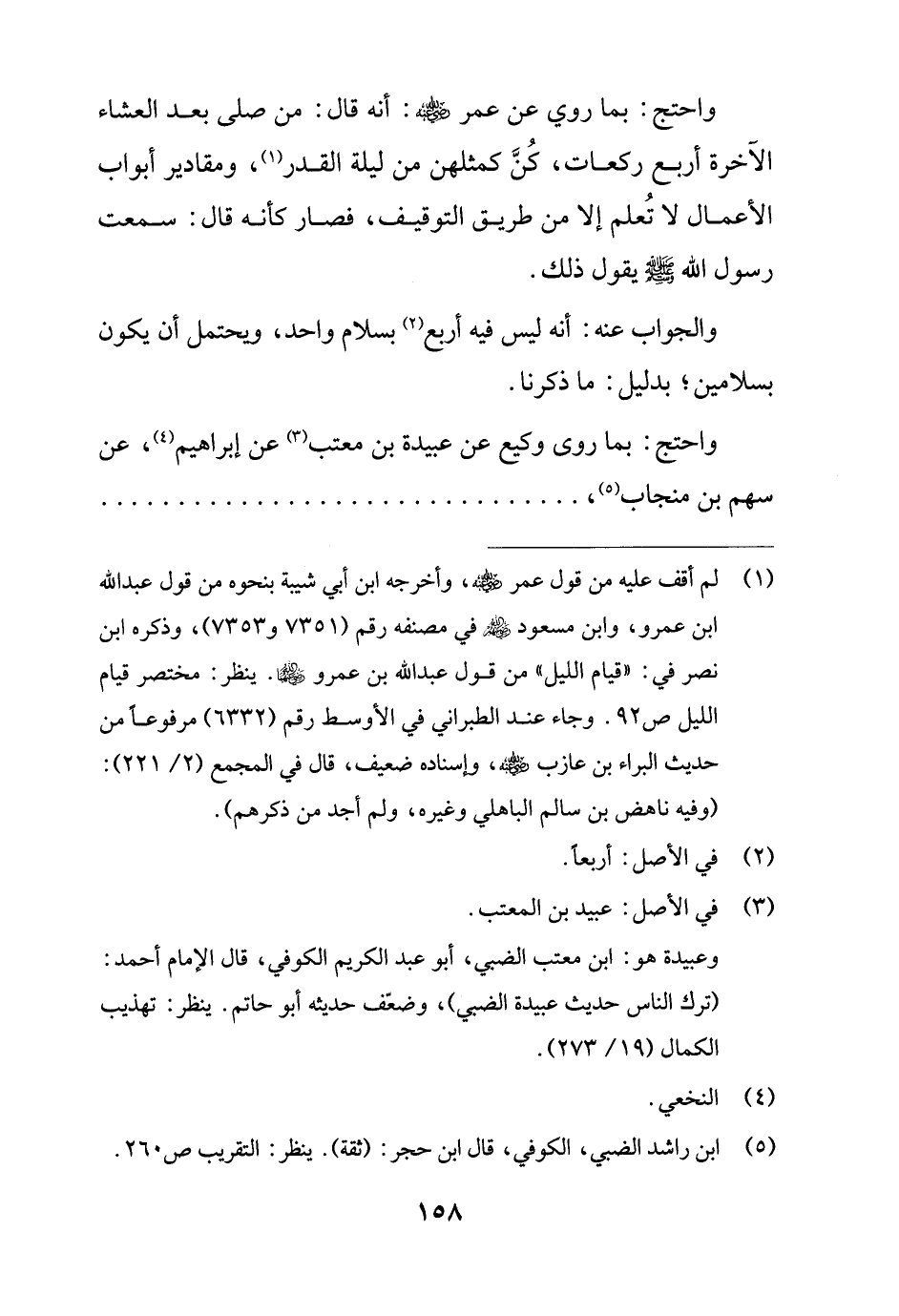 واحتج: بما روي عن عمر - رضي الله عنه -: أنه قال: من صلى بعد العشاء الآخرة أربع ركعات، كُنَّ كمثلهن من ليلة القدر (¬1)، ومقادير أبواب الأعمال لا تُعلم إلا من طريق التوقيف، فصار كأنه قال: سمعت رسول الله - صلى الله عليه وسلم - يقول ذلك.