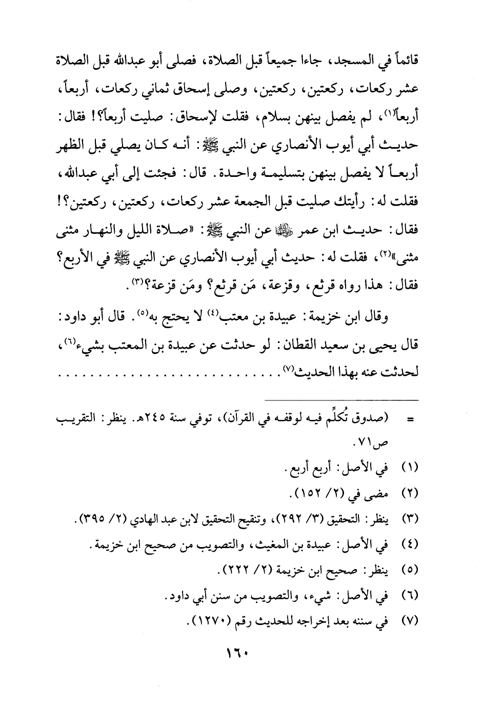 قائمًا في المسجد، جاءا جميعًا قبل الصلاة، فصلى أبو عبد الله قبل الصلاة عشر ركعات، ركعتين، ركعتين، وصلى إسحاق ثماني ركعات، أربعًا، أربعًا (¬1)، لم يفصل بينهن بسلام، فقلت لإسحاق: صليت أربعًا؟ ! فقال: حديث أبي أيوب الأنصاري عن النبي - صلى الله عليه وسلم -: أنه كان يصلي قبل الظهر أربعًا لا يفصل بينهن بتسليمة واحدة. قال: فجئت إلي أبي عبد الله، فقلت له: رأيتك صليت قبل الجمعة عشر ركعات، ركعتين، ركعتين؟ ! فقال: حديث ابن عمر - رضي الله عنهما - عن النبي - صلى الله عليه وسلم -: "صلاة الليل والنهار مثنى مثنى" (¬2)، فقلت له: حديث أبي أيوب الأنصاري عن النبي - صلى الله عليه وسلم - في الأربع؟ فقال: هذا رواه قرثع، وقزعة، مَن قرثع؟ ومَن قزعة؟ (¬3).