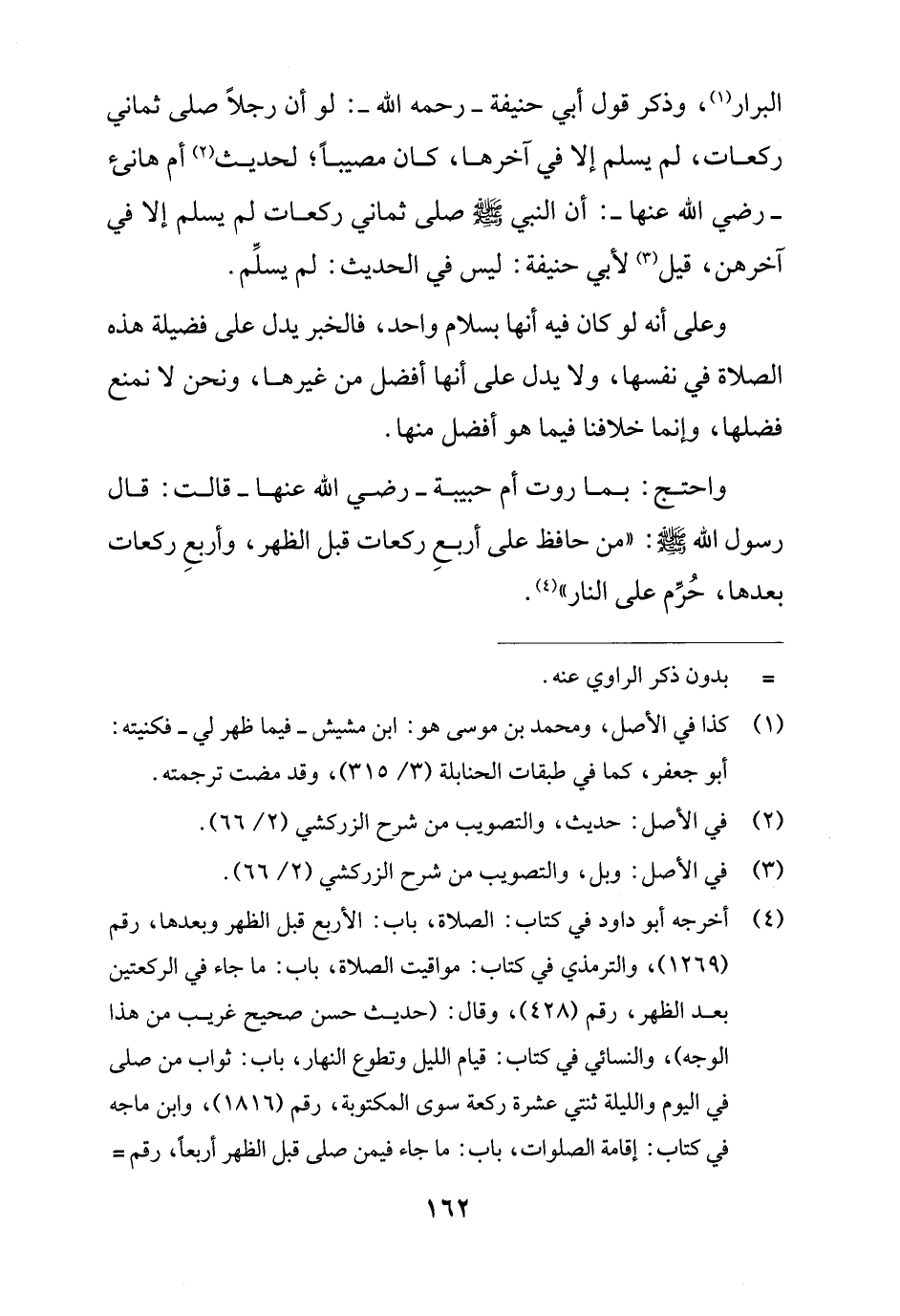 (¬4) أخرجه أبو داود في كتاب: الصلاة، باب: الأربع قبل الظهر وبعدها، رقم (1269)، والترمذي في كتاب: مواقيت الصلاة، باب: ما جاء في الركعتين بعد الظهر، رقم (428)، وقال: (حديث حسن صحيح غريب من هذا الوجه)، والنسائي في كتاب: قيام الليل وتطوع النهار، باب: ثواب من صلى في اليوم والليلة ثنتي عشرة ركعة سوى المكتوبة، رقم (1816)، وابن ماجه في كتاب: إقامة الصلوات، باب: ما جاء فيمن صلى قبل الظهر أربعًا، رقم =