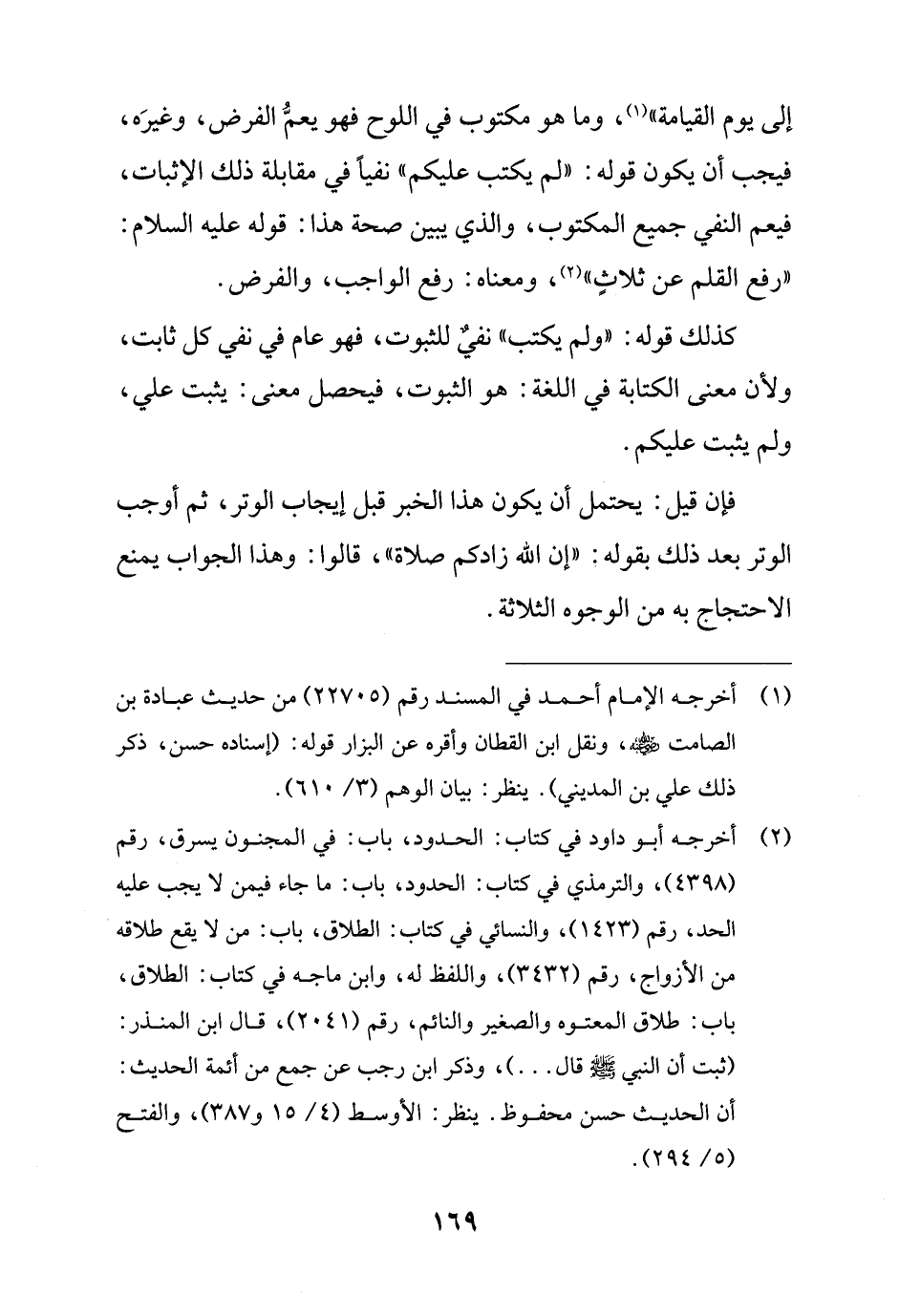 فإن قيل: يحتمل أن يكون هذا الخبر قبل إيجاب الوتر، ثم أوجب الوتر بعد ذلك بقوله: "إن الله زادكم صلاة"، قالوا: وهذا الجواب يمنع الاحتجاج به من الوجوه الثلاثة.