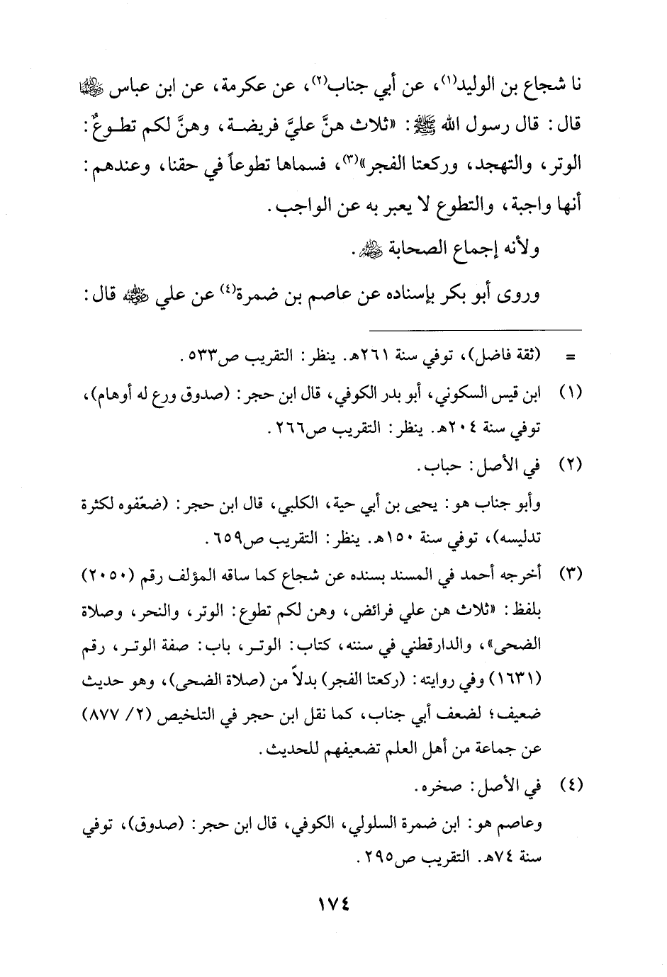 (¬3) أخرجه أحمد في المسند بسنده عن شجاع كما ساقه المؤلف رقم (2050) بلفظ: "ثلاث هن علي فرائض، وهن لكم تطوع: الوتر، والنحر، وصلاة الضحى"، والدارقطني في سننه، كتاب: الوتر، باب: صفة الوتر، رقم (1631) وفي روايته: (ركعتا الفجر) بدلًا من (صلاة الضحى)، وهو حديث ضعيف؛ لضعف أبي جناب، كما نقل ابن حجر في التلخيص (2/ 877) عن جماعة من أهل العلم تضعيفهم للحديث.