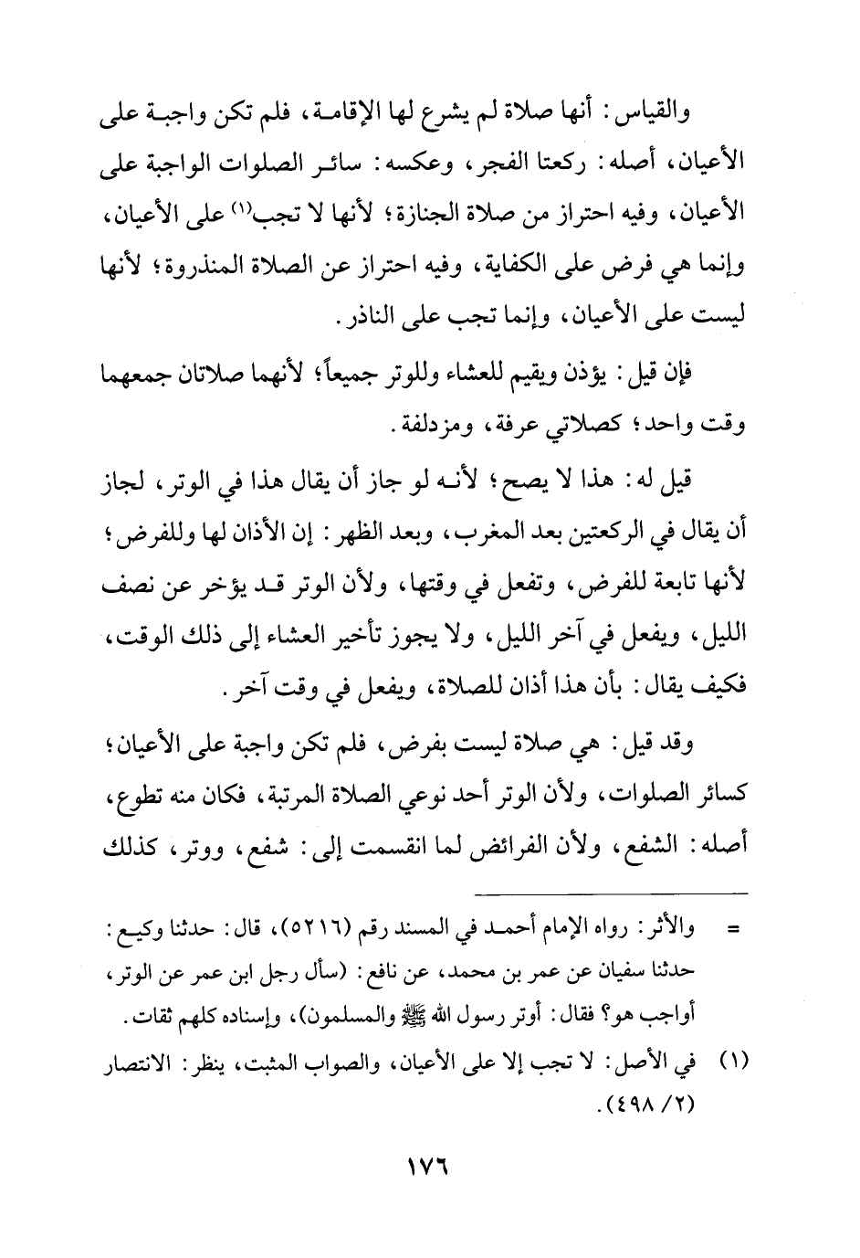 وقد قيل: هي صلاة ليست بفرض، فلم تكن واجبة على الأعيان؛ كسائر الصلوات، ولأن الوتر أحد نوعي الصلاة المرتبة، فكان منه تطوع، أصله: الشفع، ولأن الفرائض لما انقسمت إلى: شفع، ووتر، كذلك