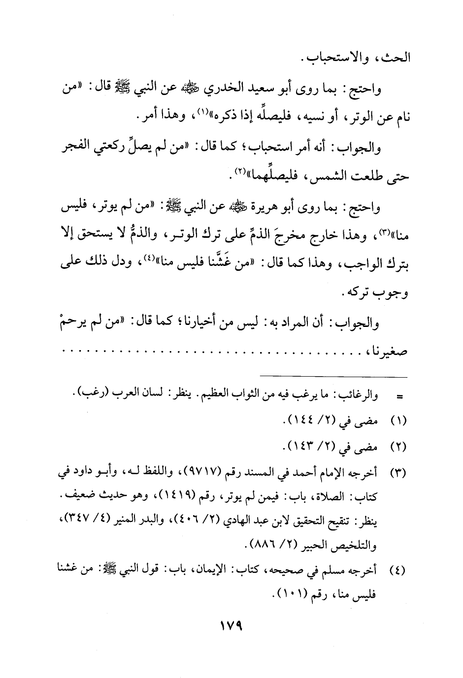 واحتج: بما روى أبو هريرة - رضي الله عنه - عن النبي - صلى الله عليه وسلم -: "من لم يوتر، فليس منا" (¬3)، وهذا خارج مخرجَ الذمِّ على ترك الوتر، والذمُّ لا يستحق إلا بترك الواجب، وهذا كما قال: "من غَشَّنا فليس منا" (¬4)، ودل ذلك على وجوب تركه.