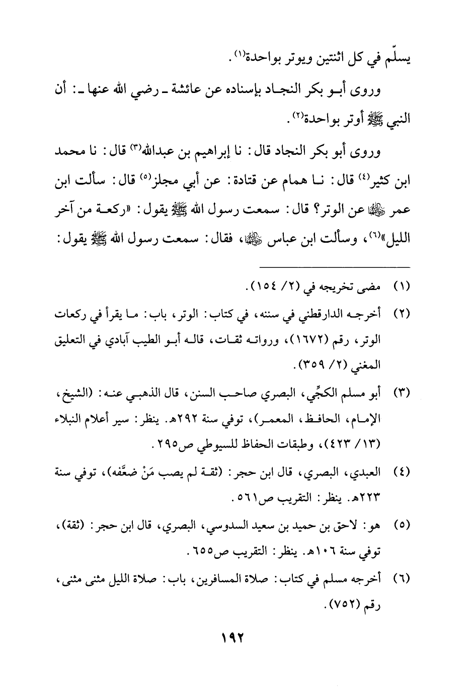 وروى أبو بكر النجاد قال: نا إبراهيم بن عبد الله (¬3) قال: نا محمد بن كثير (¬4) قال: نا همام عن قتادة: عن أبي مجلز (¬5) قال: سألت ابن عمر - رضي الله عنهما - عن الوتر؟ قال: سمعت رسول الله - صلى الله عليه وسلم - يقول: "ركعة من آخر الليل" (¬6)، وسألت ابن عباس - رضي الله عنهما -، فقال: سمعت رسول الله - صلى الله عليه وسلم - يقول: